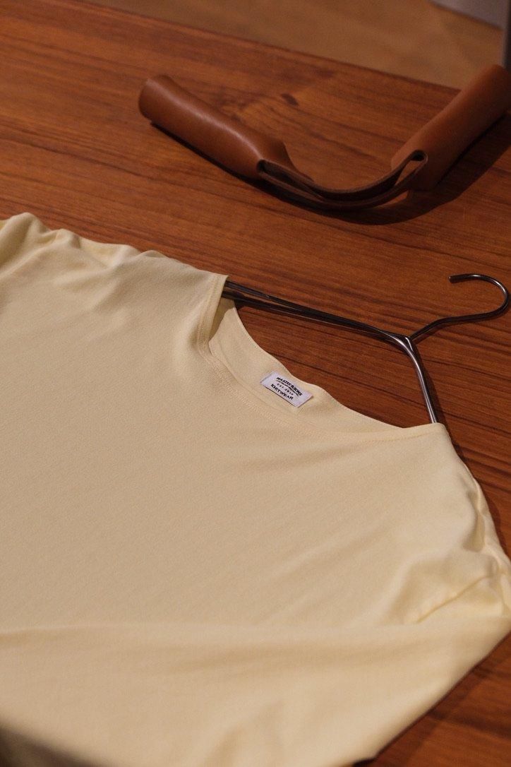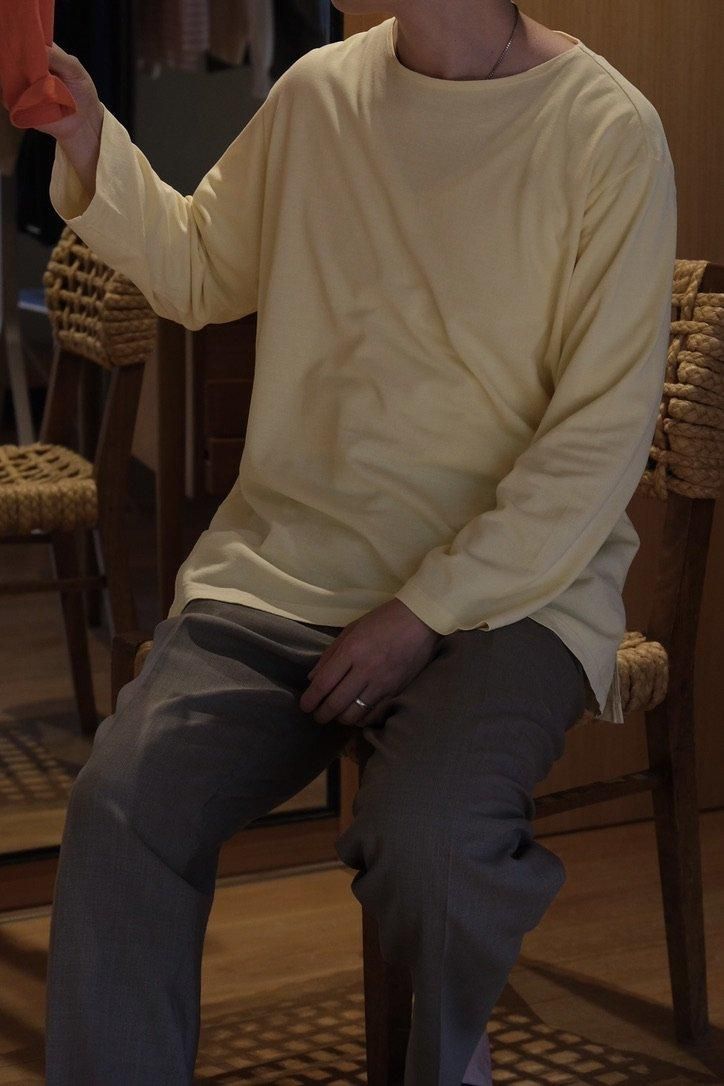 幾度か柿乃葉で別注を組ませていただいた夏の定番、和紙バスク。今作は、コーディネートに締りをもたらせる新色の黒と復刻の薄イエロー、薄オレンジの3色展開。今はとにかく湿気でベタつき、不快指数が上がる。さらには、慣れない暑さの波が身体に鞭を打ち、バテる。洋服を楽しみたい気持ちを阻害する夏の暑さが目前と迫る今こそ、改めましての和紙バスクである。今期途中参加した僕の中に芽生えた感情を言葉にすると、MAATEEの夏に対峙する"長袖の可能性"は底が知れない、だ。また、全吸収の黒は夏の大敵だという理論上、黒い服が暑いことに変わりはないし、世論が覆るような理論破壊は起きないが、MAATEEの"黒"に限って言えば抗えてしまうのではないか、ということ。独特なジャージータッチな和紙のドライな肌触りに、褪色すらも良しとする生地変化、パターンもオリジナルで差別化も可能。待っていた方も多いことだろう。シーズンの締め括りには、申し分ない1着である。