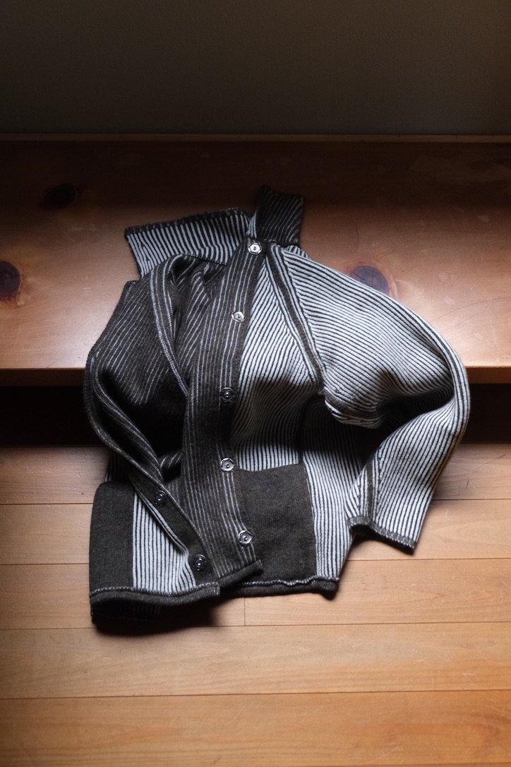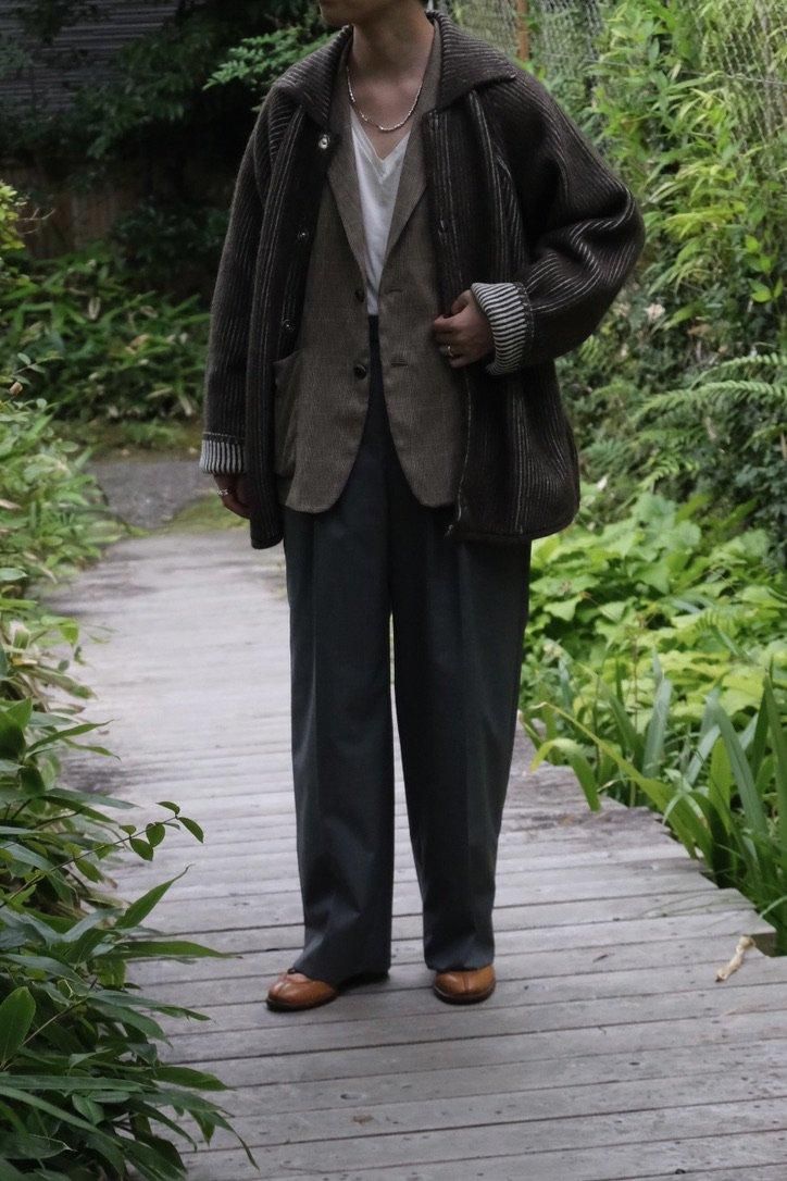 歴史と伝統が革新された素材をNICENESSはあつらえた。イギリスのウールツィードを国内紡績で表現した表情豊かな両A面のスナップカーディガンとVネックニット。袖を捲る、ボタンの留め方を変える、裏表両面を着回す、ジャケットの上から着るといったコーディネートの幅を極限にまで拡張したアウター的カーディガンと、Vシルクやシャツ、ハイゲージニットを重ね入れ冬の主役として活躍するニットは、今季の顔の1つで間違いない。原毛を5色に染め分けることで生まれる多色ツラが飽きることなく、毎日クローゼットに手を伸ばしてしまう衝動を掻き立てそうだ。