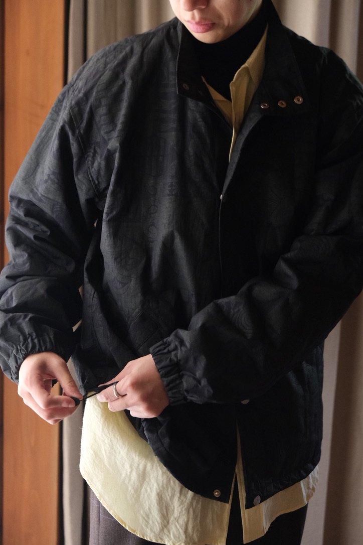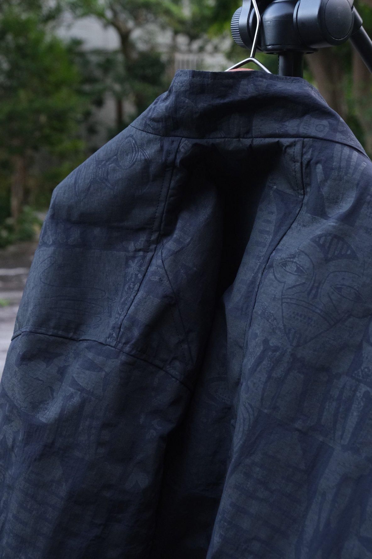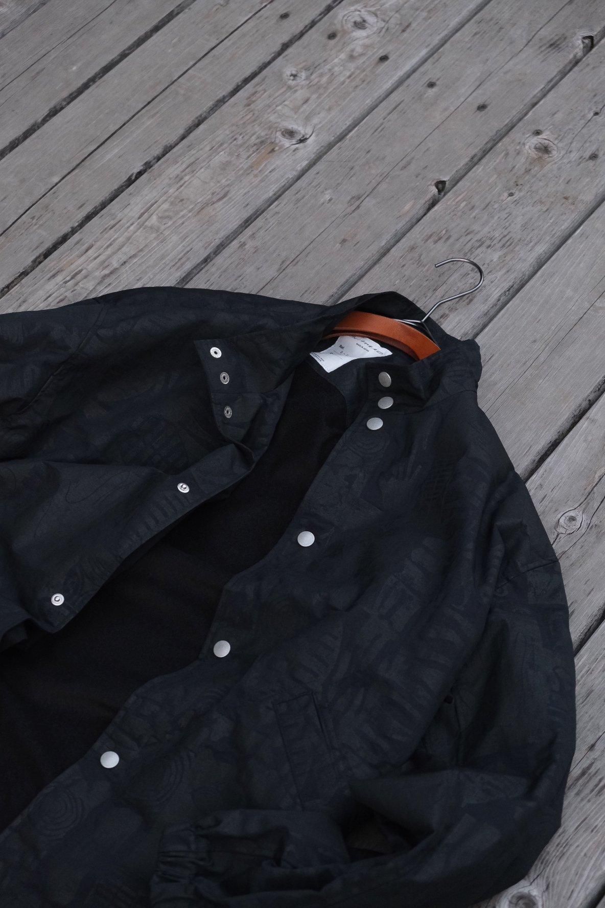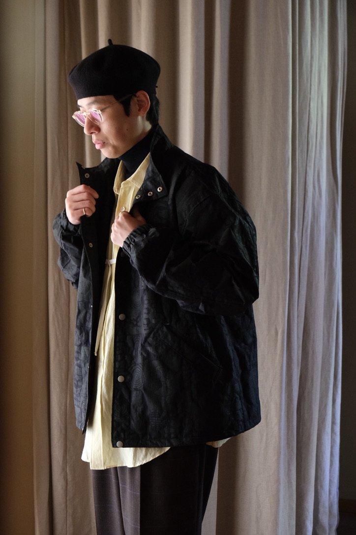BLACKBIRD的解釈で生まれたスポーティさやアウトドアスタイルとクラシックの二面性を併せ持つデザインとなった、テック系セットアップ。ウールのコートやジャケットなど、相反するトラディショナルなアイテムとの掛け合わせでコーディネートのハズしとして意識している。アフリカの版画から着想を得たプリミティブな柄とナイロン素材のコントラストが際立つジャケットに、ミルスペックのディテールを踏襲したオリジナリティ溢れるクライミングパンツは本格的な作りながらも意外と癖は少ない。また無地に見えるボディも、光量の差によって凹凸感のある陰影が見え隠れし、ギャップのあるプロダクトをリアルなバランスで落とし込んでいるのもポイントが高いのではないだろうか。また、裏毛仕様で、これから気温が落ち着いてくる頃合いに持っておくと安心だろうとおもう。