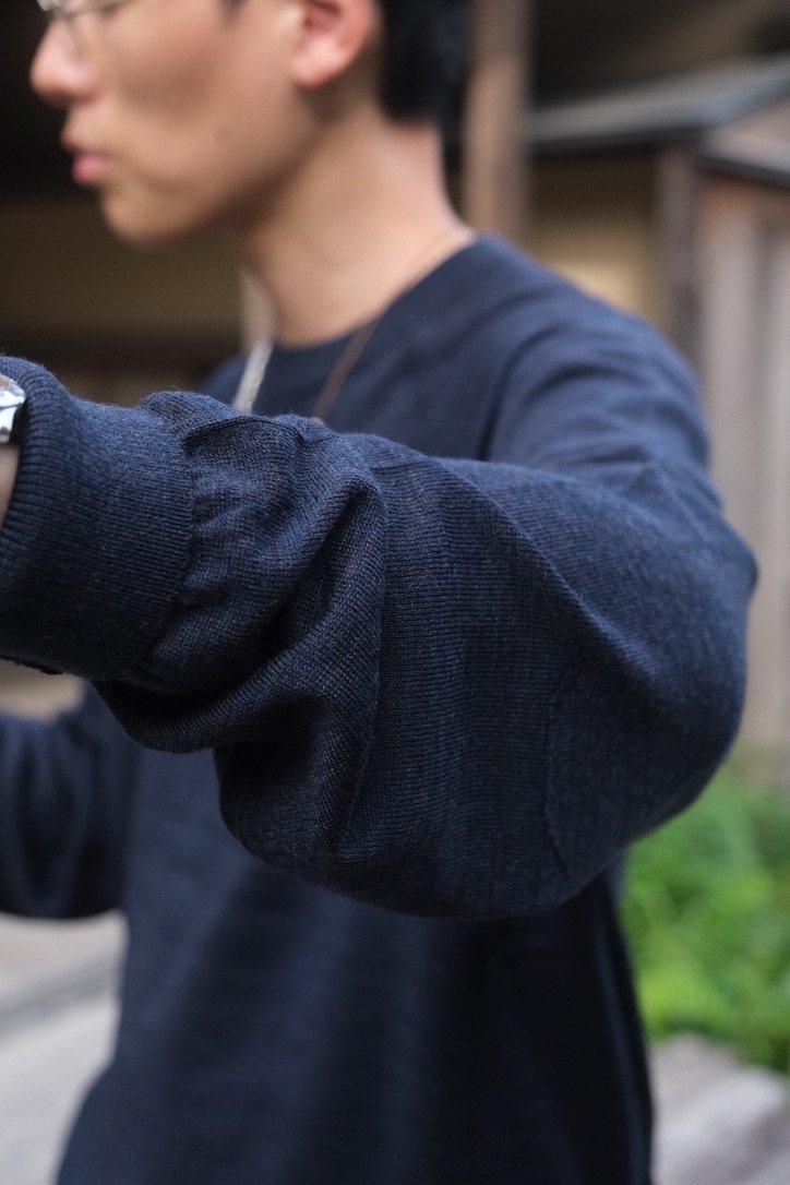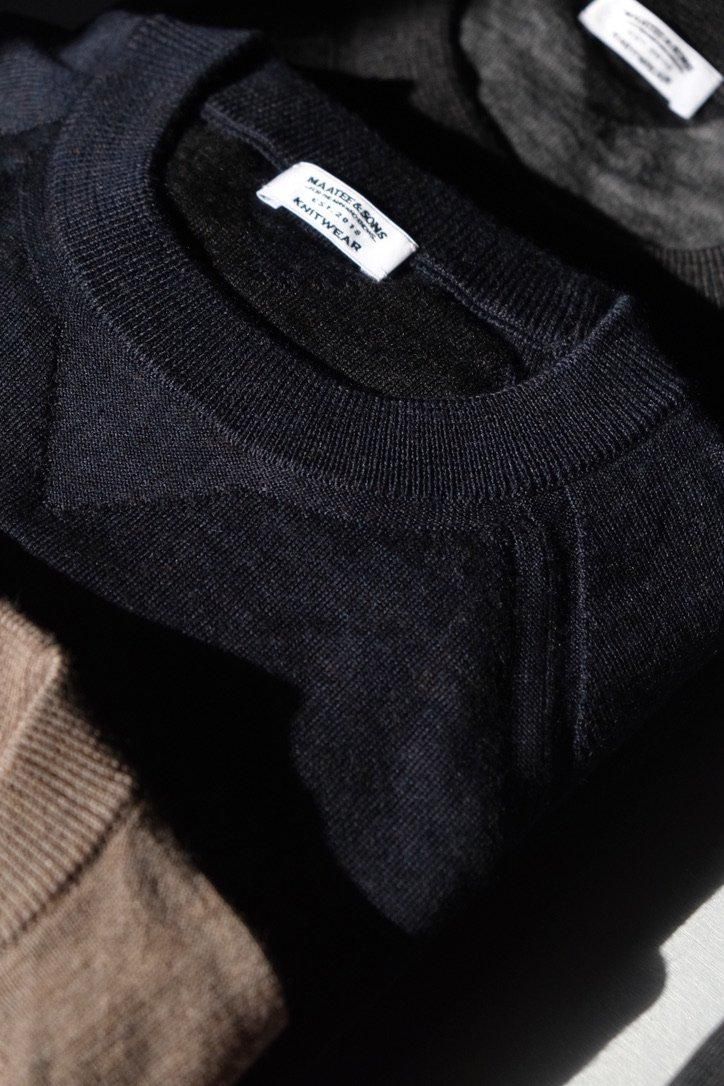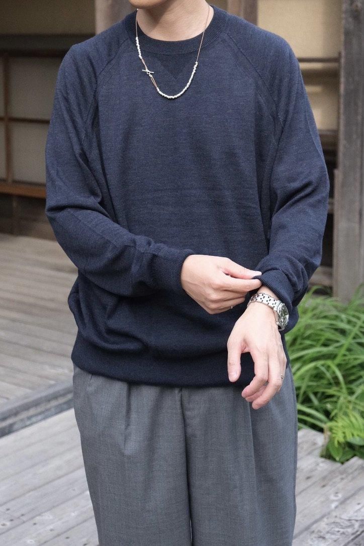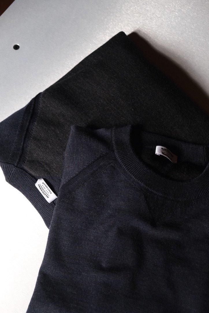 今年も夏が長かった。ようやく秋の入り口が見える頃合いとなり、MAATEEもようやく(?)冬仕様に取り掛かる。晩秋あたりから重ねていけそうな中厚手なものから紹介する。TUBE状に編んだセーターは、まさにスウェットのようなニットで1枚でも重ねてでも着用できる。またリバーシブル仕立てにしており、表と裏で異なる表情を見せるのも面白い。前後の身頃に生地をがっちゃんこしたようなテクニックで縫い、ハイゲージニットながら中厚手くらいの膨らみがあり温かい。選びやすいカラーパレットながらも遊び心は随所にある、"ありそう、でない"を表現した1枚はこの秋から重宝するだろう。