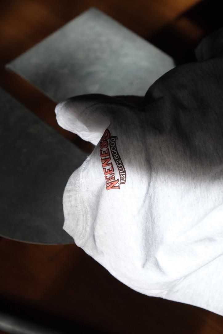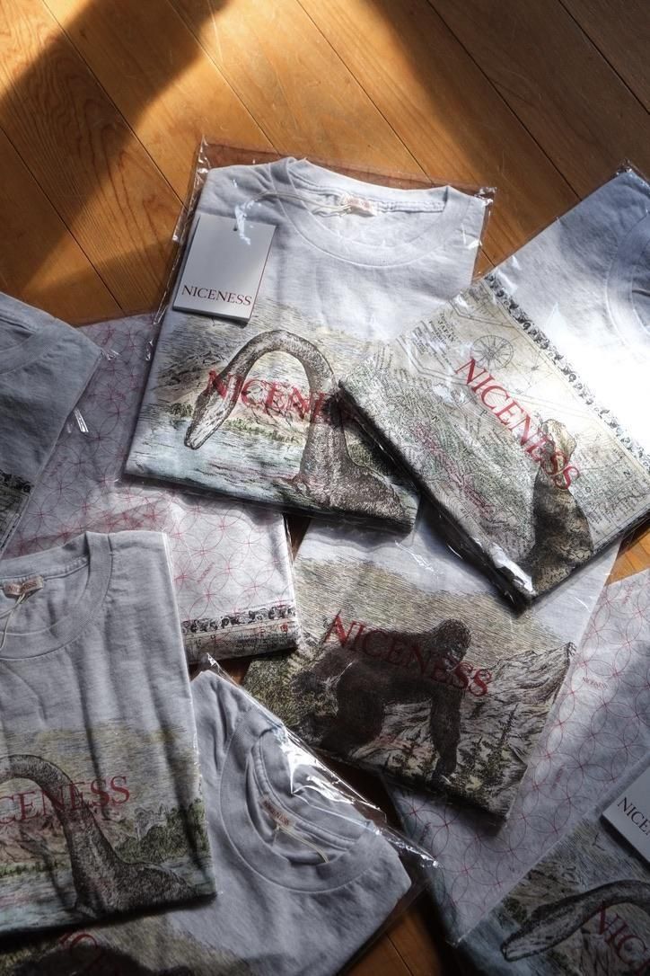 古着好きの間でも知られるオールドバナリパのアニマルTeeを NICENESSの解釈で解体し、そこにUMA(未確認動物)を落とし込むというなんともシャレの効いたもの。なんともジェネレーションギャップの生まれそうな内容だが、ワイドショーなんかでも取り上げられテレビを見た次の日には、土の中や大きな池に確認しに行った記憶が僕にもある。それを絵画のような繊細で奥行きのあるタッチで、杢な生地に落とし込み、全体に靄がかかったような雰囲気ある1枚を表現した。シャツやジャケットインなどどう着るかは自由だが、きっと季節が深まってもつい手にとってしまうような後世に語り継がれるものになることは間違いないと思う。