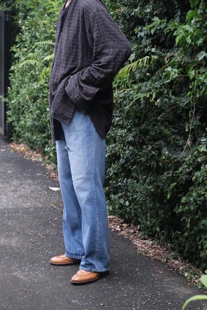 もう誰もフレアに疑問を抱かなくなった今、既存の世界線にほんのりと辛いスパイスを投入してみたくなった。毎シーズン変わるディテールに飽きはない。フルレングスで左右の膝あたりにリペア跡を施し、色落ち度合いもちょうど良く、マイサイズのヴィンテージを見つけたようで嬉しさを感じる。ライトオンスで履きやすくシャツ、グラフィックTeeにジャケットと秋を遊ぶところから、狙ったアイビースタイルを謳歌できる冬までも日本の季節を股にかけて大いに活躍しそうな予感がする。