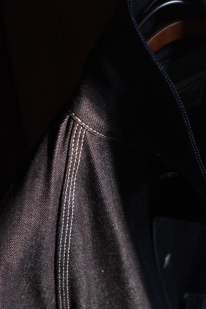 テーラーとワーク、この2つのバランスの良さがEESETT&Coならではだとおもっていて。元ネタがきっとあってそこにオリジナリティがしっかりと乗っているからこそ唆られるところであり、自由度の高い1着だと思う。特筆すべきは肩の作り方でフロントはラグラン仕様、バックがセットインの逆スプリット。そしてならではのZIP使いと、バリエーションに富んだポケットたち。前立てや裾の始末はワーク感を限りなく消しテーラー要素を盛り込む縫製に。適材適所のステッチワークにもオリジナリティを感じる。着込んでいく際の経年変化も面白いと思うし、これぞ現代版・漢のカバーオールというべき逸品である。