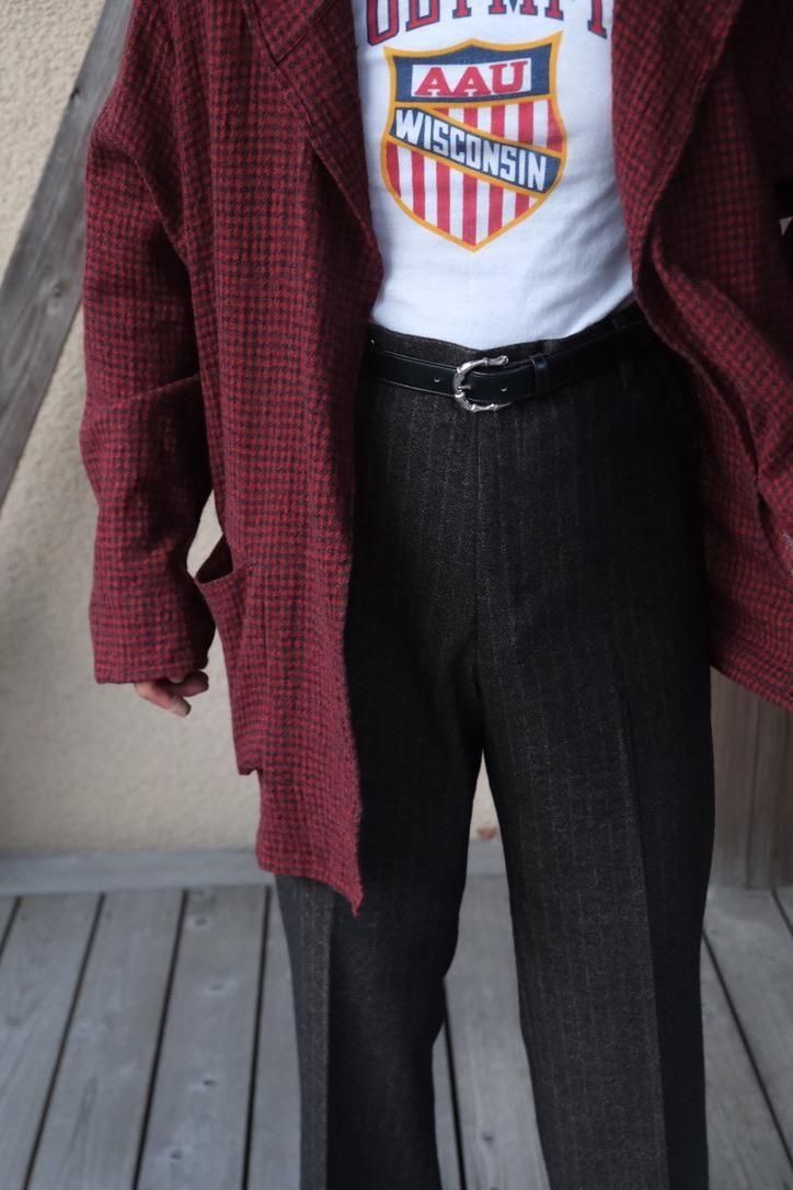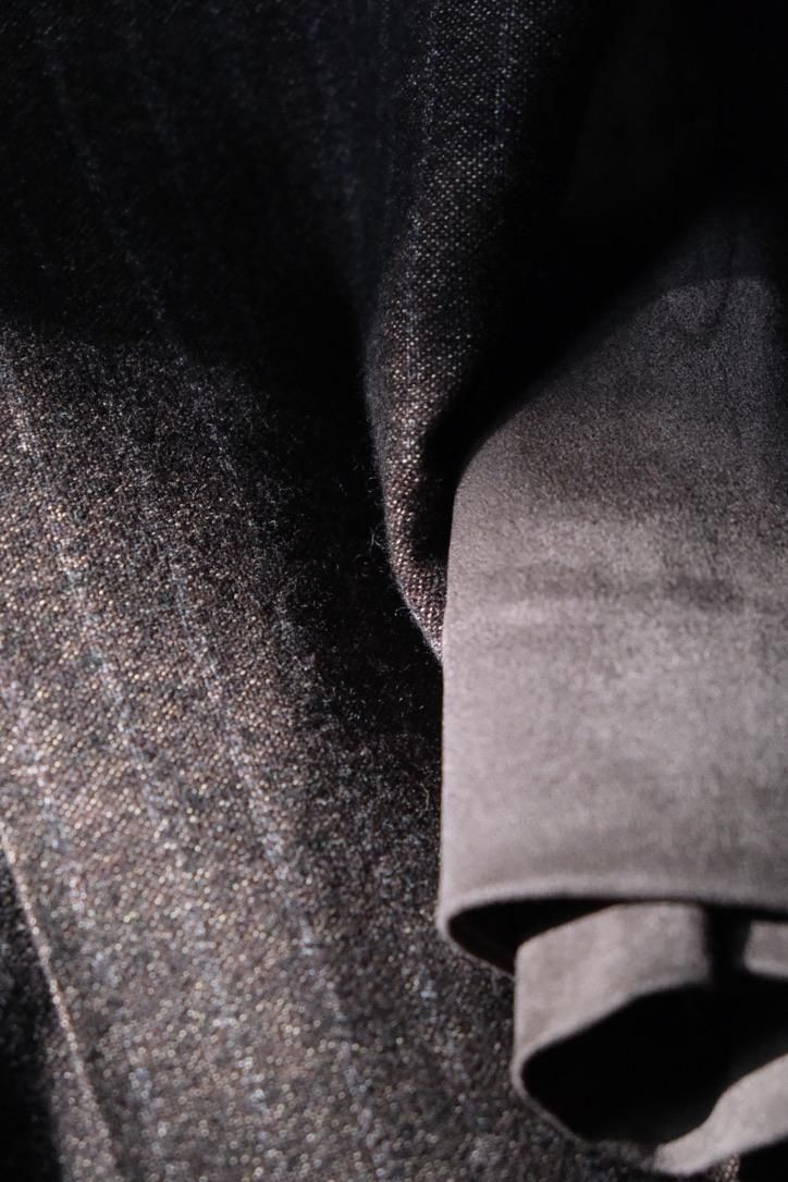 スラックス疲れの方へもお勧めしたい、ニュースタンダードの代表格。2タックのズドンと太いストレートを右腕に伸びてきたブランドから出る、ノータックのやや細めなスラックスは新鮮味と"今"を反映している点で差別化のしやすい1本だ。得意の化繊系ミックスでオトナ面なブラウンのチョークストライプと、使い方としてはデニムのようなイメージでガシガシと汚れを気にせず履けるウルトラスエード。エムズ流、冬寄りの秋冬パンツ。革靴からブーツ、スニーカーまで足元を綺麗に収めてくれ、自身の全ての選択肢を増やしてくれる1本。以前よりウエスト、ヒップ周りを少し大きくしている為、間違いなく履きやすくなっていると思います。