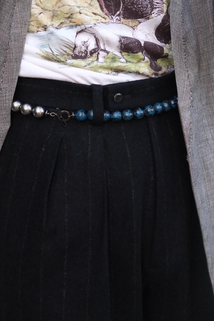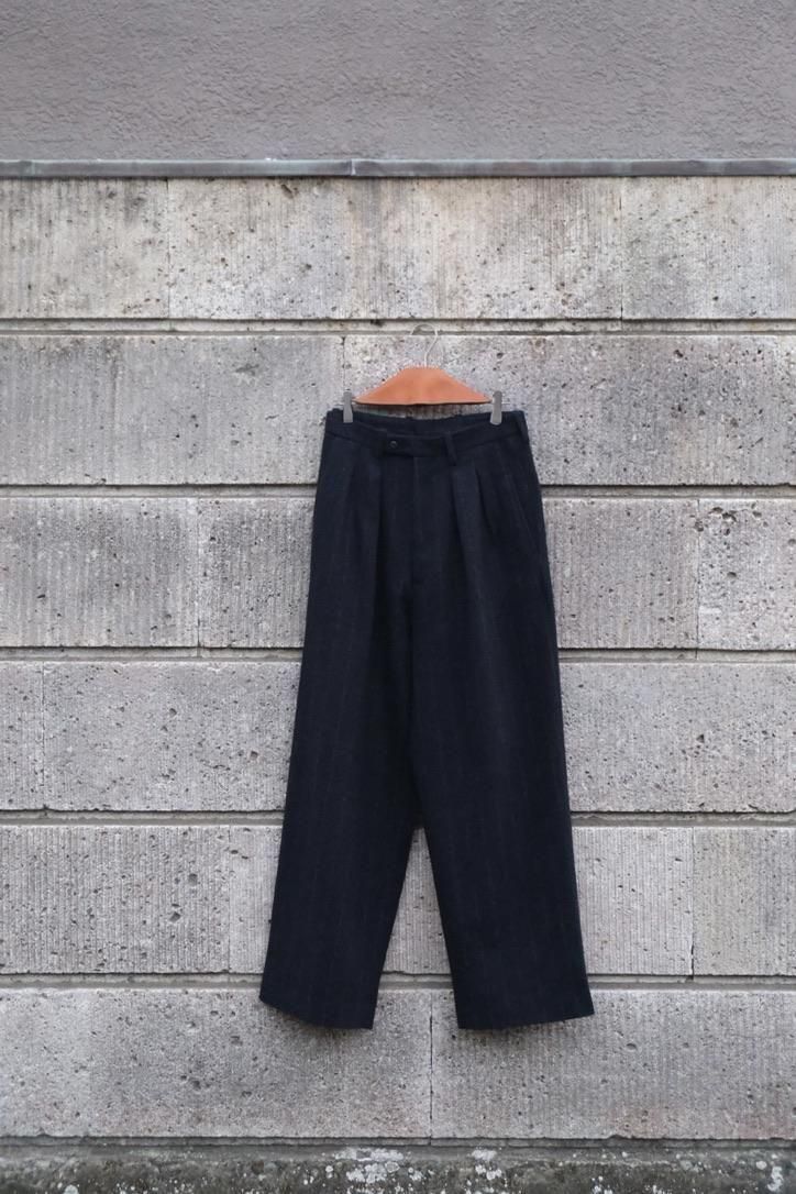 流行り廃り関係なく、多くのファンを魅力してやまないエムズの最高傑作。緻密に計算されたパターンニングにより成せるシルエットの美麗さは、履いた者にだけ分かるものだ。また生地選定にも強い同ブランドだからこそのウールに化繊ブレンドの"The秋冬感"に玄人感が滲み出る。洗練されたイメージの中での生地のギャップが、古着を合わせたとしても品を損なうことがない雰囲気を助長する。メンズのスタイリングはボトムスから。初めましての方もファンの方へも、間違いないスタイリングを提案できそうだ。