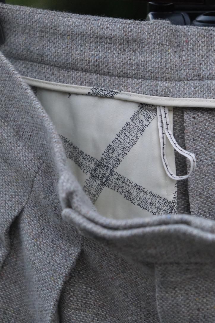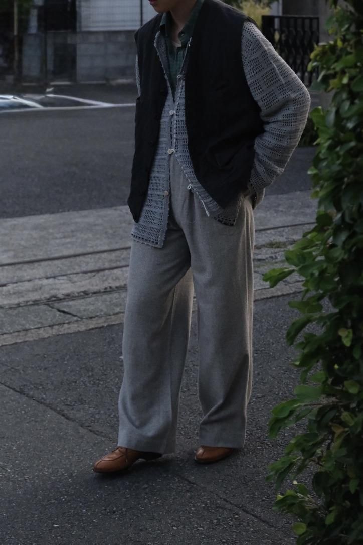 流行り廃り関係なく、多くのファンを魅力してやまないエムズの最高傑作。緻密に計算されたパターンニングにより成せるシルエットの美麗さは、履いた者にだけ分かるものだ。また生地選定にも強い同ブランドだからこそのウールに化繊ブレンドの"The秋冬感"に玄人感が滲み出る。洗練されたイメージの中での生地のギャップが、古着を合わせたとしても品を損なうことがない雰囲気を助長する。メンズのスタイリングはボトムスから。初めましての方もファンの方へも、間違いないスタイリングを提案できそうだ。