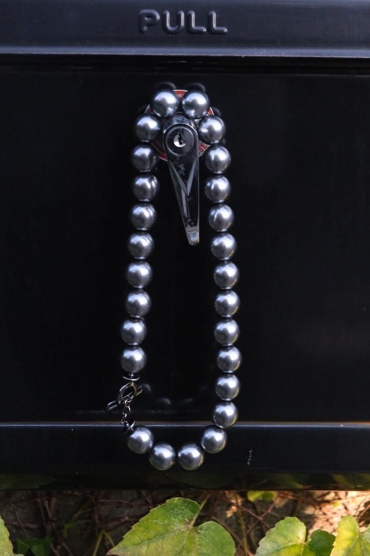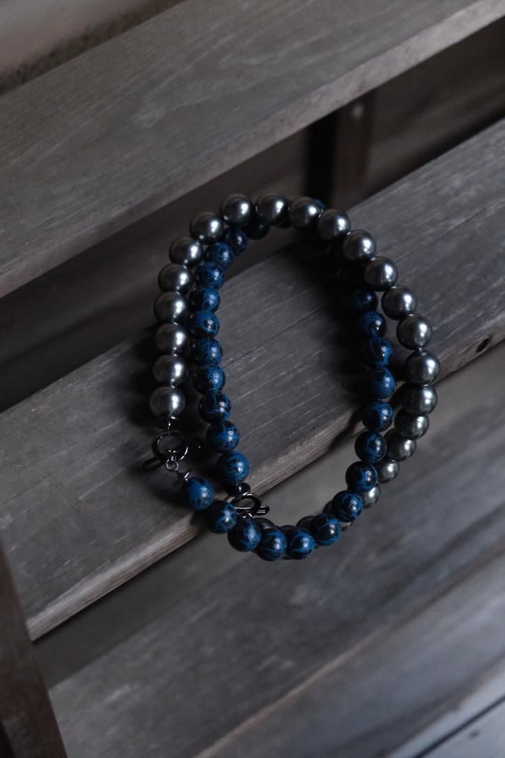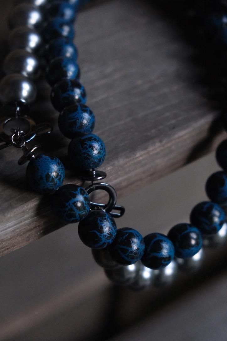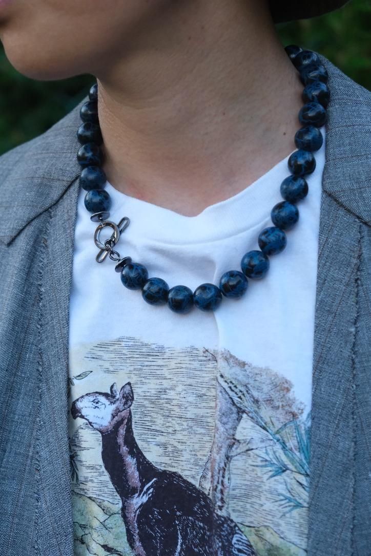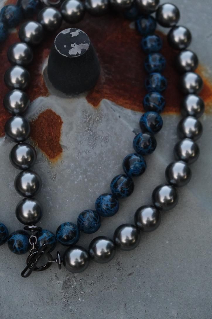 掘り下げても分からなさそうな謎めいた雰囲気をもち、貴金属だけのジュエリーとはまた異なるベクトルで楽しんでもらえる、ビーズネックレス。毎日つけられるようなデザインではないので、たまに手に取るのもあっていい、いつもと違う自身を表現?演出?するには丁度いい、というそんな感覚で。デッドストックの合成樹脂にクラックが入る青黒玉と、黒真珠のような艶やかな灰玉のコントラストが過去作にはない表情に。ひとつひとつ表情や味が変わるのも、古着を理解している我々からすればきっと"愛着"と捉えていただけるはず。ひと繋がりでも、ジョイントを外して各色単体でも、ウエストに巻ける方にはベルトのような感覚でも楽しい。そしてメイドインフランス。ここにもグッとくる方はいるのではないでしょうか。