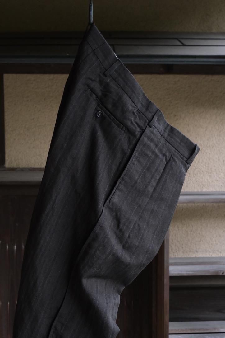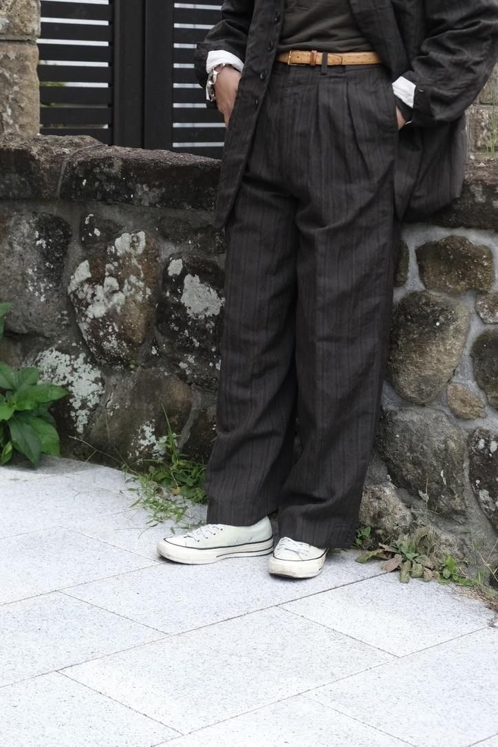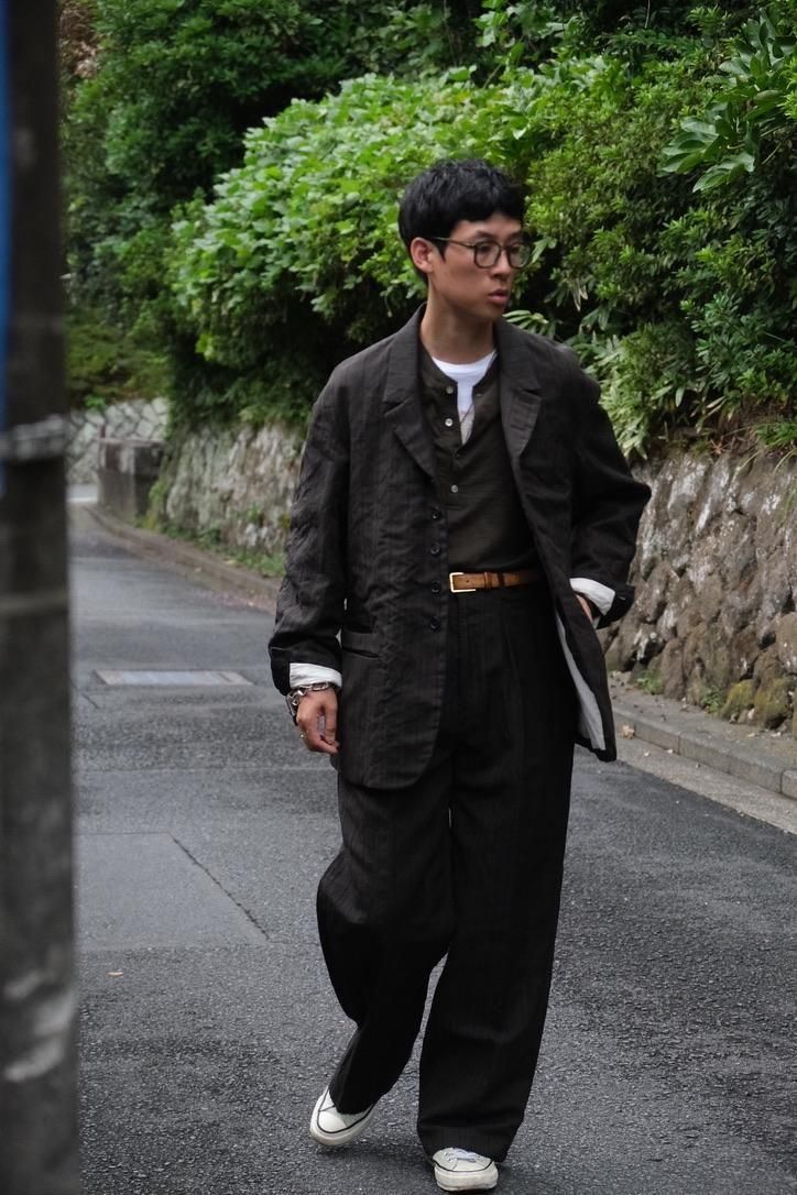 セットアップという魅惑的ワードの中にあって、コーディネートの幅というところでは上下の組合せのほかに単体の強さが求められるが、NICENESSがかつて無い程の雰囲気とクオリティを2つの素材で打ち出してきた。懐古的意匠にナイスネスのオリジナリティが合わさり、美しいパッカリングと着古したような生地の膨らみが職人気質を助長する。Z撚り独特のドライな表情をした"H"と、ウールとリネンが交織する奥行きのある表情が特徴の"S"のそれぞれに最適解の色とシルエットをリンクさせてゆく。セットアップを提案してこなかったハナレにおいてかつてないほどの熱量で、上下提案の風が吹き抜ける。気負わず純粋に、セットアップを楽しんで欲しい。