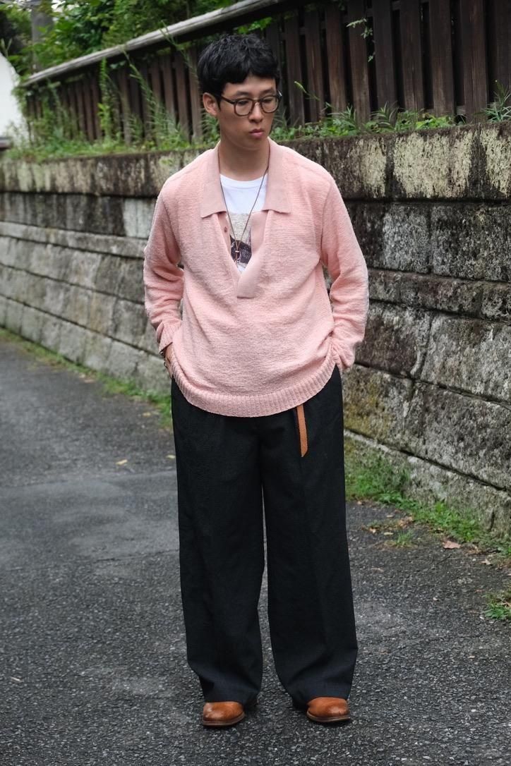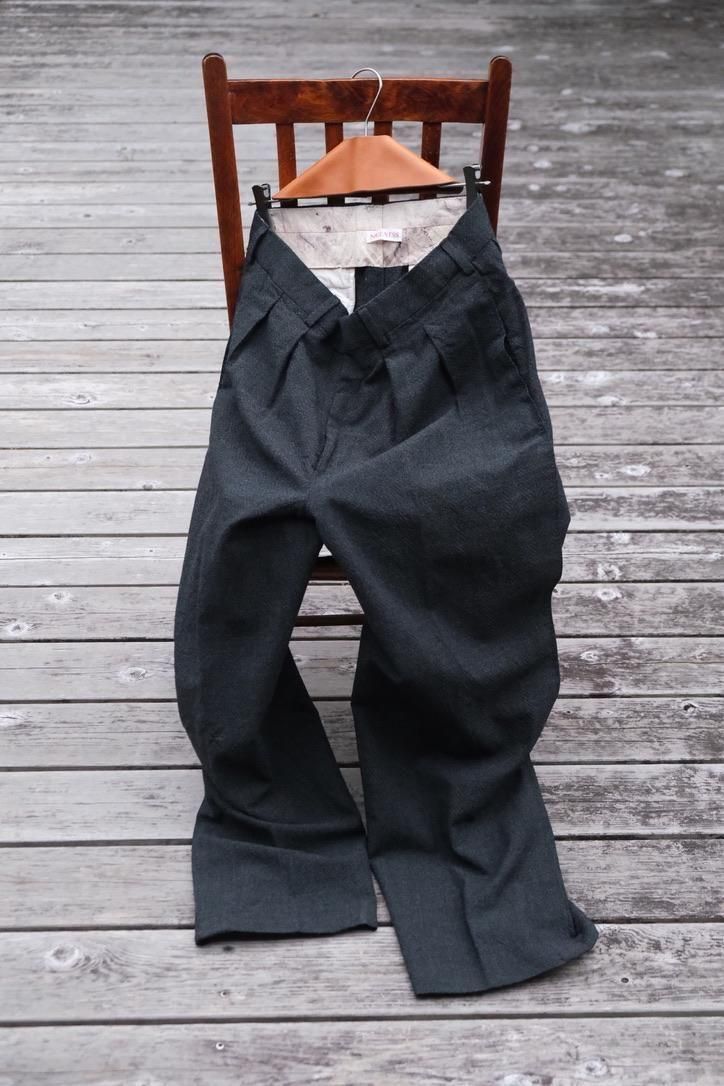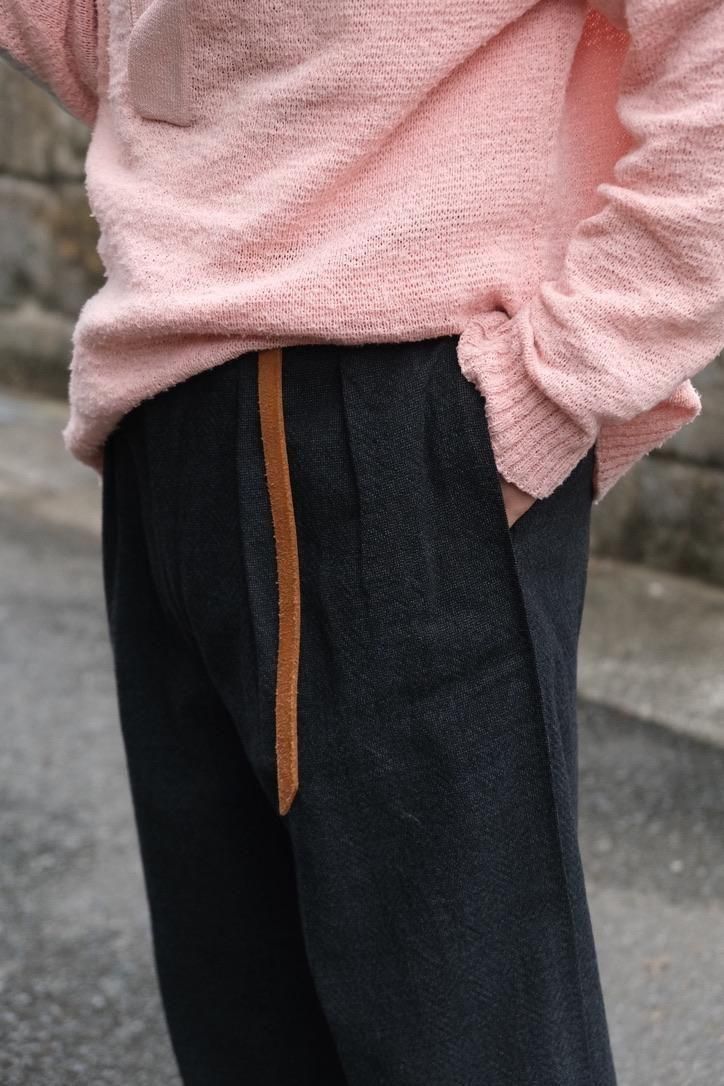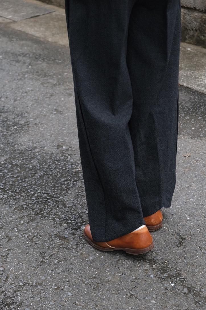 セットアップという魅惑的ワードの中にあって、コーディネートの幅というところでは上下の組合せのほかに単体の強さが求められるが、NICENESSがかつて無い程の雰囲気とクオリティを2つの素材で打ち出してきた。懐古的意匠にナイスネスのオリジナリティが合わさり、美しいパッカリングと着古したような生地の膨らみが職人気質を助長する。Z撚り独特のドライな表情をした"H"と、ウールとリネンが交織する奥行きのある表情が特徴の"S"のそれぞれに最適解の色とシルエットをリンクさせてゆく。セットアップを提案してこなかったハナレにおいてかつてないほどの熱量で、上下提案の風が吹き抜ける。気負わず純粋に、セットアップを楽しんで欲しい。