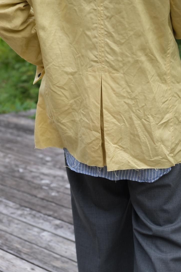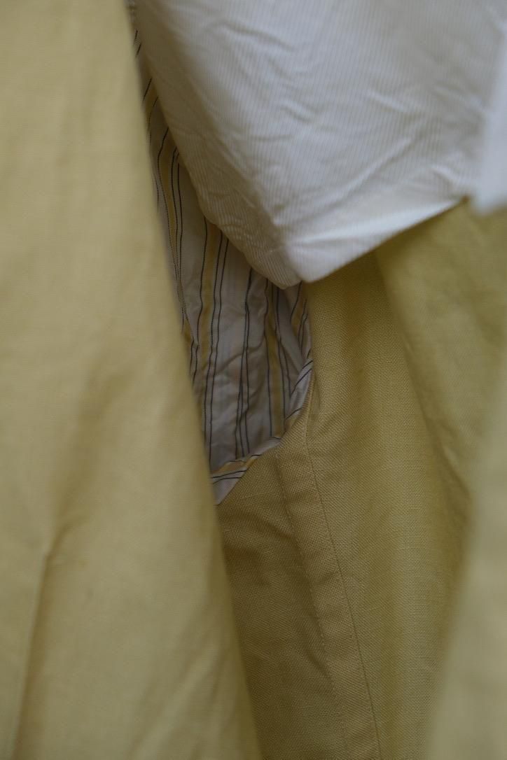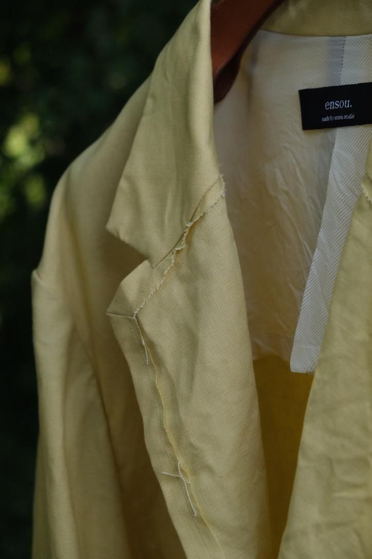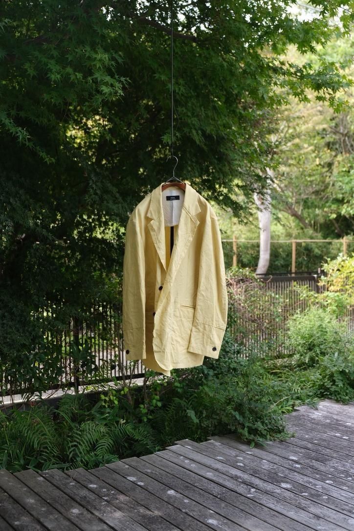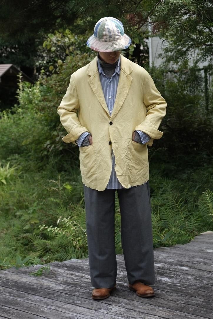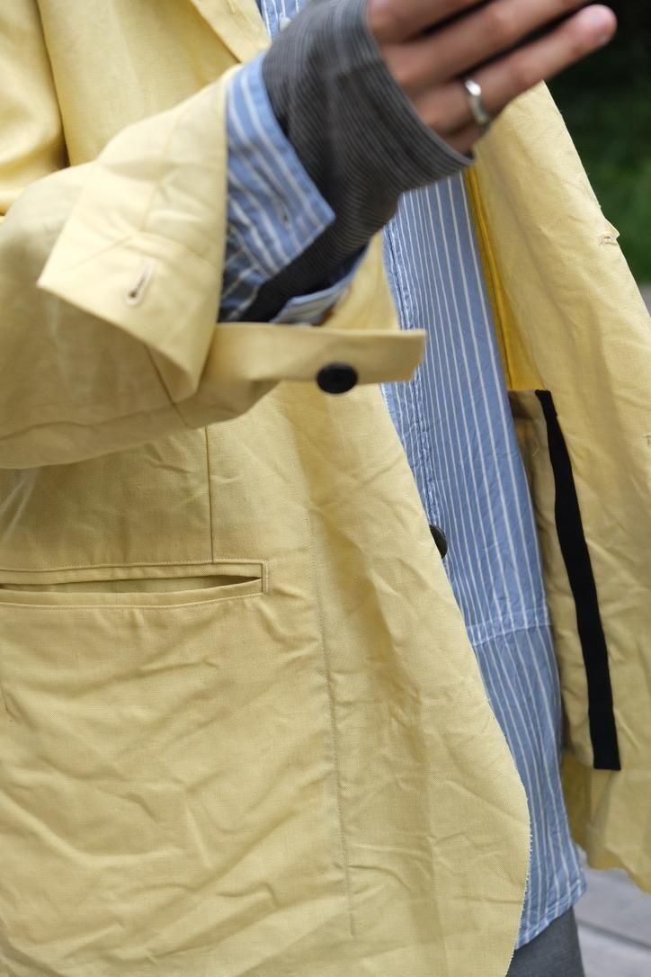 昨年末に柿乃葉で受注会を行なった今作を、中にニットやシャツを着てちょうど良いこれからの季節に改めて提案したいと思った。着るというより羽織る感覚で、獣毛系のものが増えてくる中でリネンの見え方もまた面白いのではないか。名門W.Billのプリっとしたヘビーリネンにフロントから裾にかけて全て裁ち切り、"完成させないデザイン"のSALシリーズに乗せたジャケットは糸がほつれ飛び出るが故のラフさに、トラウザー合わせでも堅苦しくならない。パキッとしないスモークネイビーには毒っ気のある色を合わせても良いし、太陽の力が弱まる秋冬には明るいイエローは新鮮に映るだろう。ジャケットとしても中間的役割としても振れてしまうリネンだからこその着方を、この秋から楽しんでいってほしい。