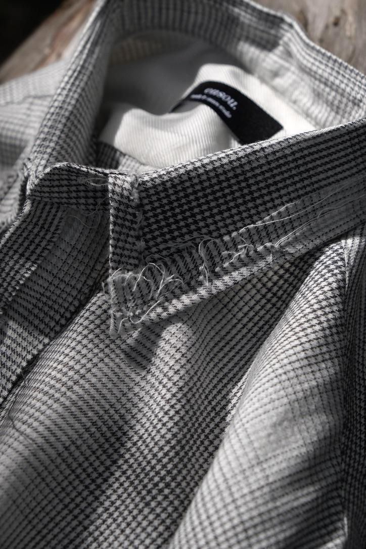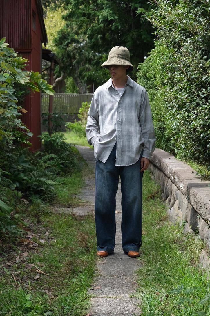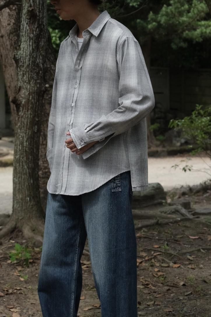 ensou.のラフカットシャツは、今ではハナレに無くてはならない存在となった。一見マイルドな顔をしているのにどこかエッジが効いていて、スパイス的役目な香りがするし、断ち切りデザインは、ひと手間を加えなければ生まれないディテールで完成形に"敢えて手を入れる"ことで、ジャケットの下に放り込んでもドレス"過ぎる"ことはない塩梅になる。遠目で見ればアメカジなオンブレチェックのような表情で、近くで覗き込めば色差のあるハウンドトゥースが交差している。遠近で楽しめる稀有な印象。