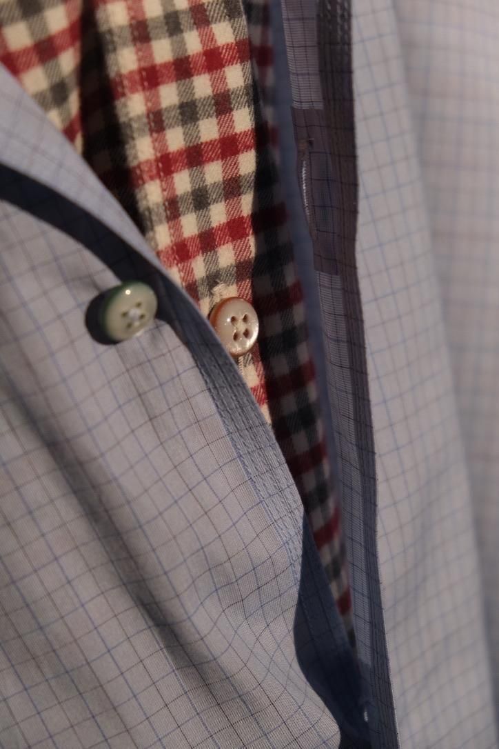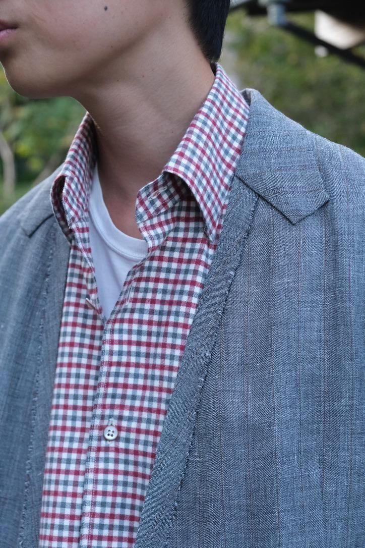 ドレス崩しという方向性が、今までのマーティのドレスシャツ類より顕著に出ており、カジュアルにラフにを楽しめる新型サンジェルマン。袖山を敢えて低くし、袖幅を広くとることで日常生活においてよりリラックス感を生む。スナップの隠しBD仕様で、下に入れるもの上重ねるものによって気分で襟を変えてもいいだろう。裾はボックスシルエットで大きくスリットが入る。カジュアルな風貌の中に、ボタンホール裏のハンドソーンのガゼットや、配色の異なるボタンなど抜かりないディテールは健在。ブルーのミックスチェックは通年を見据えるポプリン地で季節性を問わない汎用性が売りな一方、レッドチェックはコットンネル素材で毛羽立ちを含めてこれからの季節を見据えた生地となる。それぞれにどう着ていくか、新しいこれからのMAATEEのシャツスタイルに期待が膨らむ。