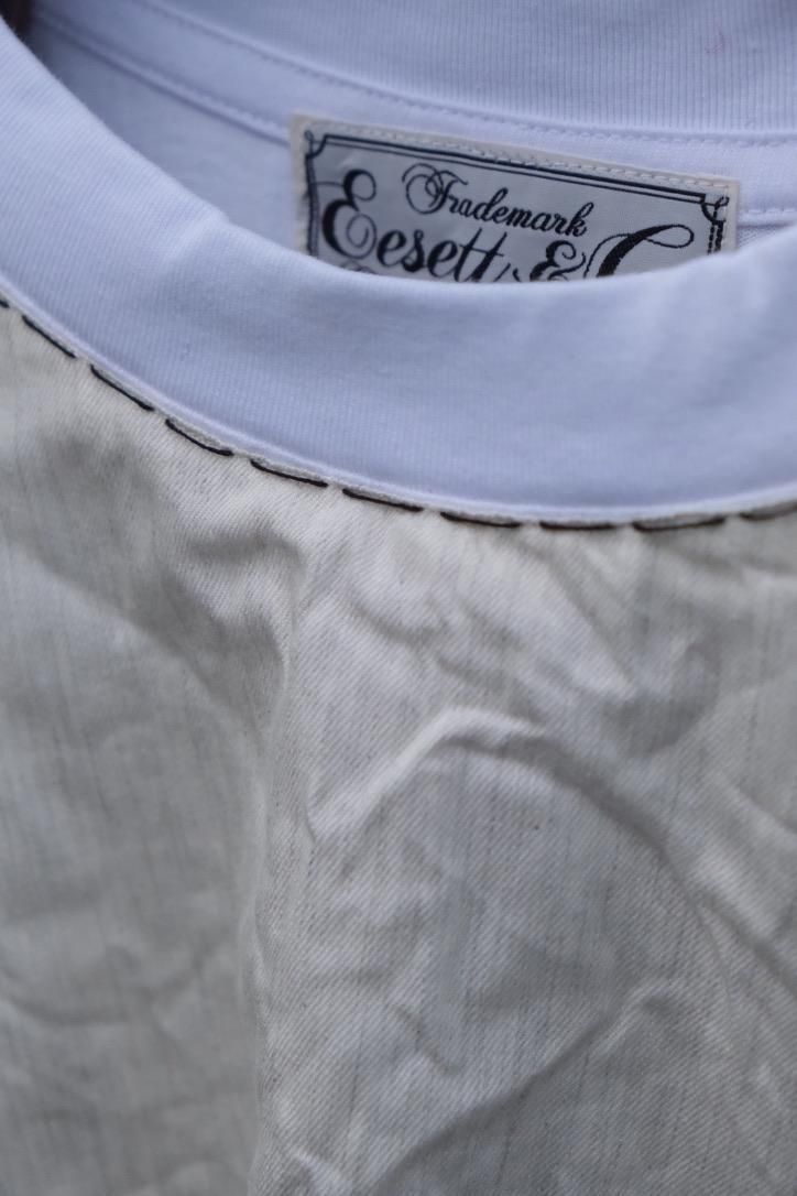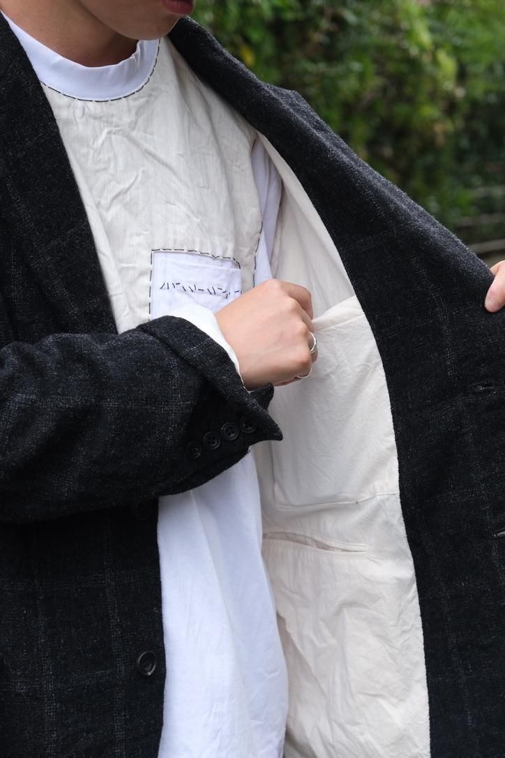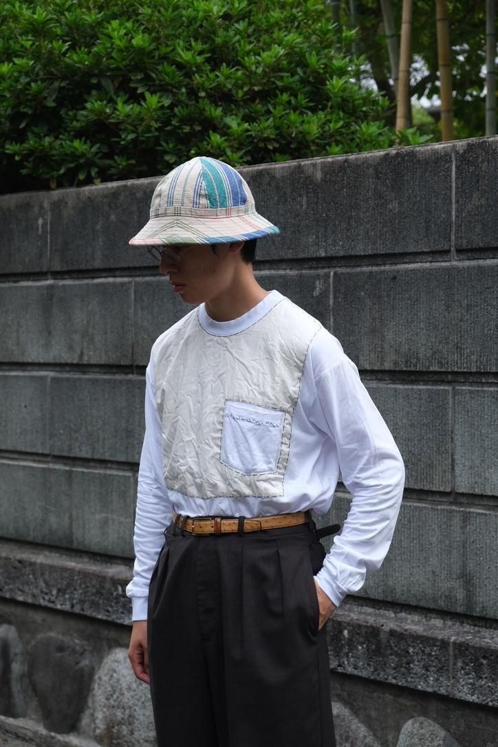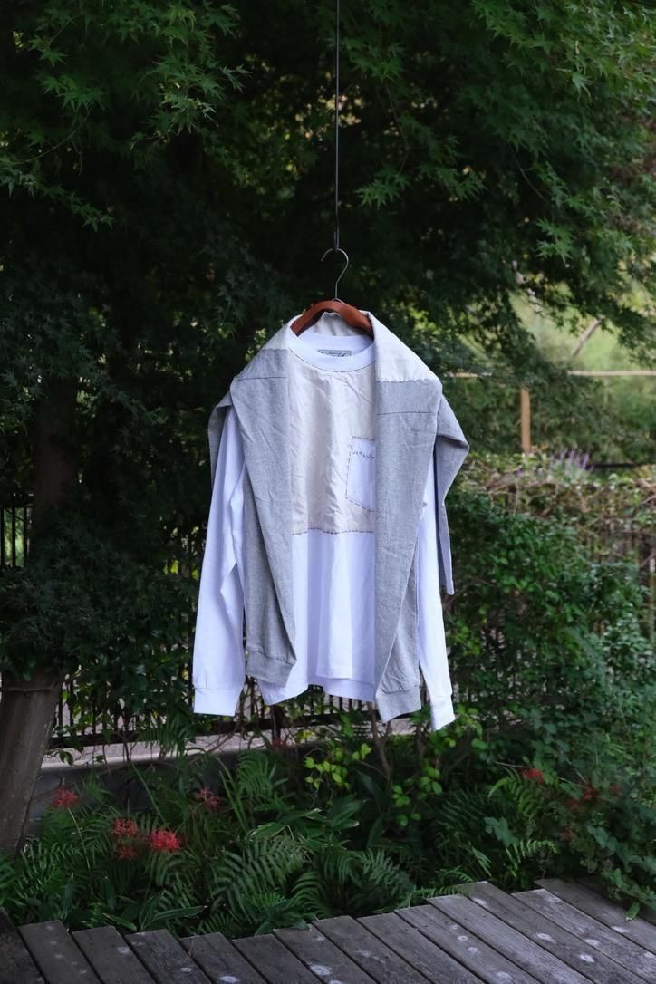 この発想は面白いと思った。これからの季節のリアルなスタイリングはシャツが軸にあって、インナーにカットソーやハイゲージのタートルなどを重ねていく。ジャケットの下に1枚で刺さるカットソーはデザインを求められるし、探すと意外と見つからなかった。天竺生地と杢感のあるシャツ生地を粗めのハンドステッチで貼り合わせた、何ともイイセットらしい1枚。ベーシックな中にも遊び心を効かせた、この時期に着たい他にはない主役級のデザイン。