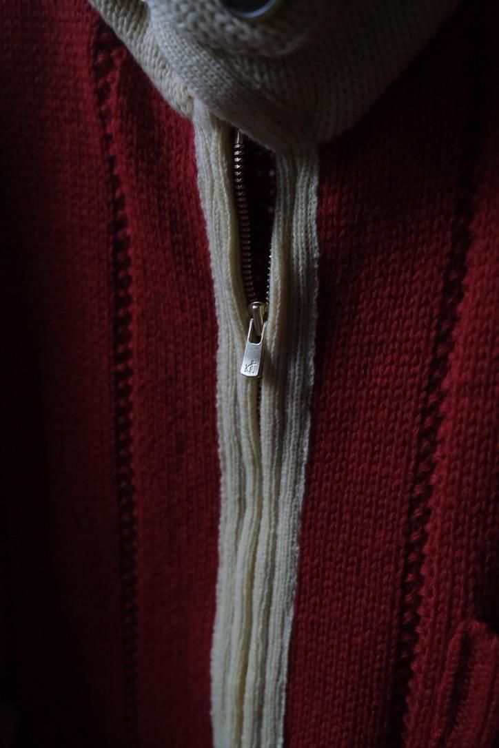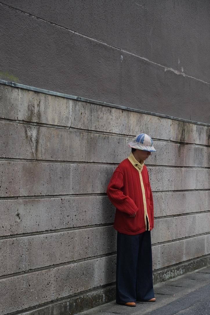 ハンティングジャケットというオトコの土臭く堅物なイメージを小原さんのテクニックと発想で、今までに経験したことのない柔軟な仕上がりについ頬が緩む。開閉式ダブルジップにはYKKエクセラが使われており、ニットの色によってジップそのものの色分けする細かい心遣いも嬉しい。サックスには濃いブルー、レッドにはイエローのラムウールとカシミヤの襟でチンストラップを留めてもチクっとしないなど、小原さんの優しい気遣いがデザインとして効く。デニムからスラックスまで何でも合わせられる点、発色の良さを活かしとことんスタイリングを楽しもう。