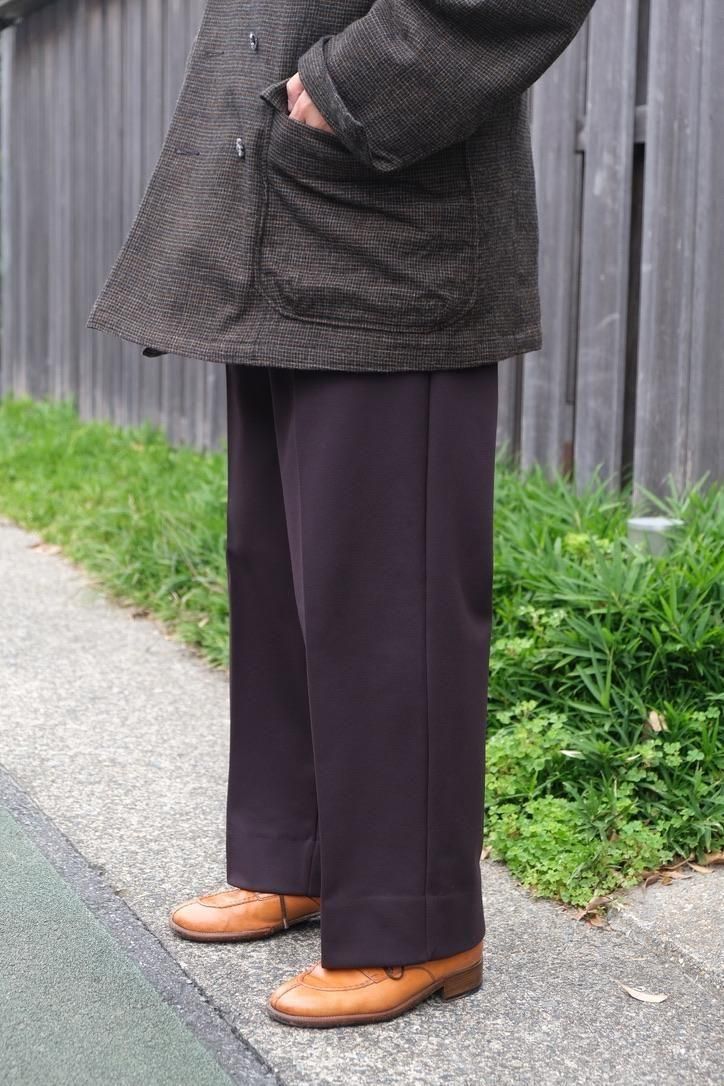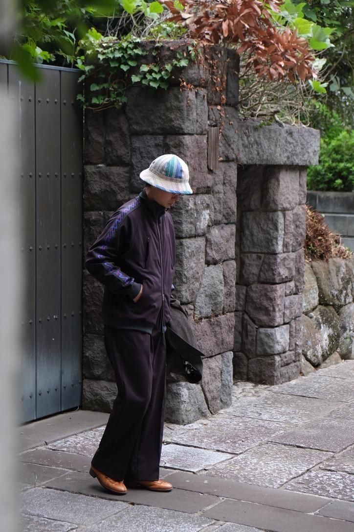 春秋のシェルとしても秋冬のインナーとしてもの汎用性を求めて、デニムやレザージャケットを長年にわたり提案してきた中で"ジャージ"という選択肢は今までになかった。とはいえ、ヴィンテージを漁っていた10代の頃にトラックジャージは着用していて、今となってはどこか懐かしい気持ちと求めているドレス崩しのイナタい塩梅がマッチするコレはとても良いと思った。老舗の作り手による甘撚りスビン混のジャージ生地は、当時に70年代のデッドで手にしたあのもっちり感を蘇らせる。オールド感漂う側章のNN柄とその色使い、裏毛の肌あたりも文句なく、キッチリした装いを良いバランスで崩していくカキノハの新しい要素としてワードローブに加えていってほしい。