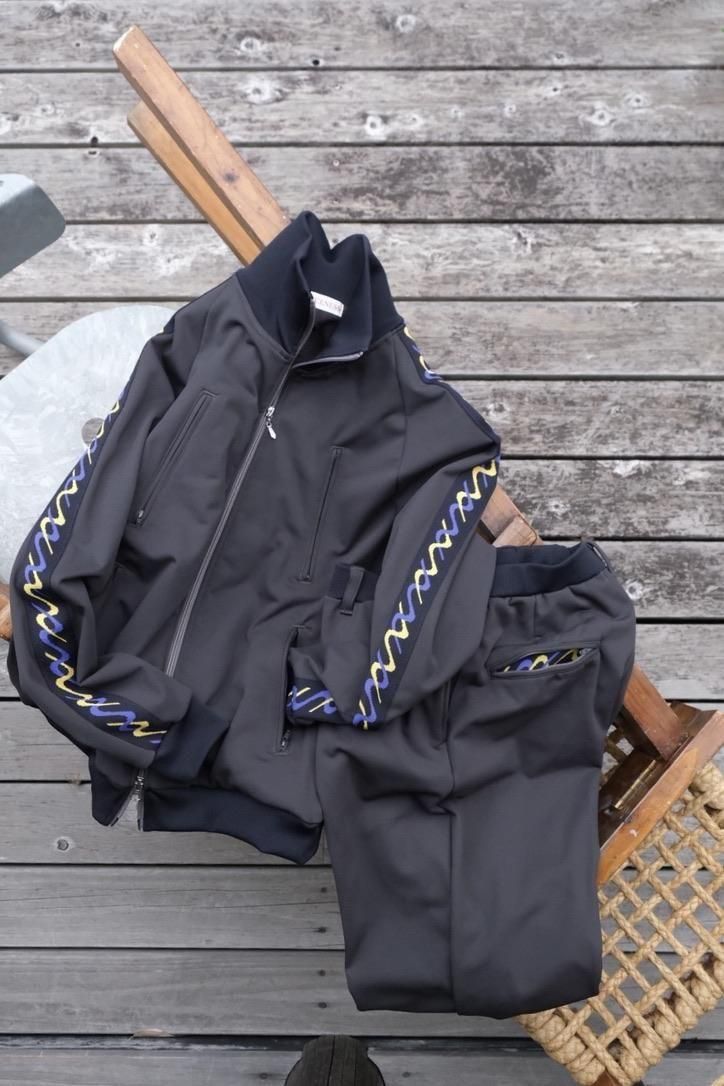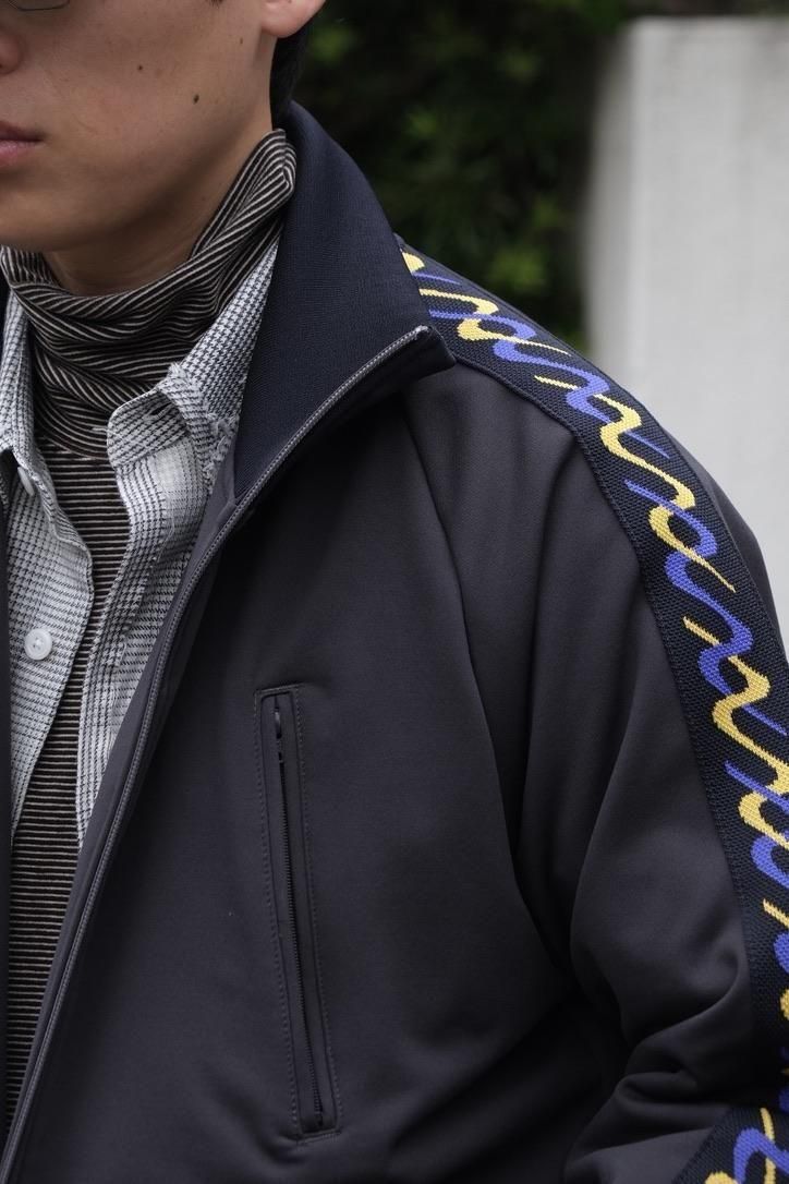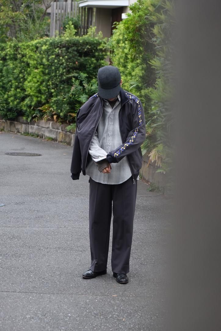春秋のシェルとしても秋冬のインナーとしてもの汎用性を求めて、デニムやレザージャケットを長年にわたり提案してきた中で"ジャージ"という選択肢は今までになかった。とはいえ、ヴィンテージを漁っていた10代の頃にトラックジャージは着用していて、今となってはどこか懐かしい気持ちと求めているドレス崩しのイナタい塩梅がマッチするコレはとても良いと思った。老舗の作り手による甘撚りスビン混のジャージ生地は、当時に70年代のデッドで手にしたあのもっちり感を蘇らせる。オールド感漂う側章のNN柄とその色使い、裏毛の肌あたりも文句なく、キッチリした装いを良いバランスで崩していくカキノハの新しい要素としてワードローブに加えていってほしい。