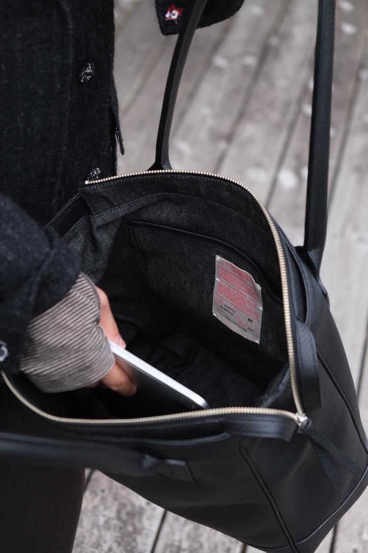 ツールバッグをソースとし横型でアクティブに動くことを想定したLANDSが記憶に新しいところだが、縦型のDOYLEは全くの別顔になった。ハンドルを支点として肩から手先までのタテの範囲で動くにとどまるが、レザーの分量が増え、視覚的な満足度は高まったように思う。使っている13.3インチPCがすっぽりと入ってしまう容量で、床に置いても自立することに加え、ジップを閉めればプライバシーも守れるビジネス顔も伺える。素材の作り込みだけでなく縁取りのパイピングやNNハンドルの結合部など細かい職人技が光り、ヴィンテージ感と現代的な質感がうまく融合しているトートバッグといえよう。