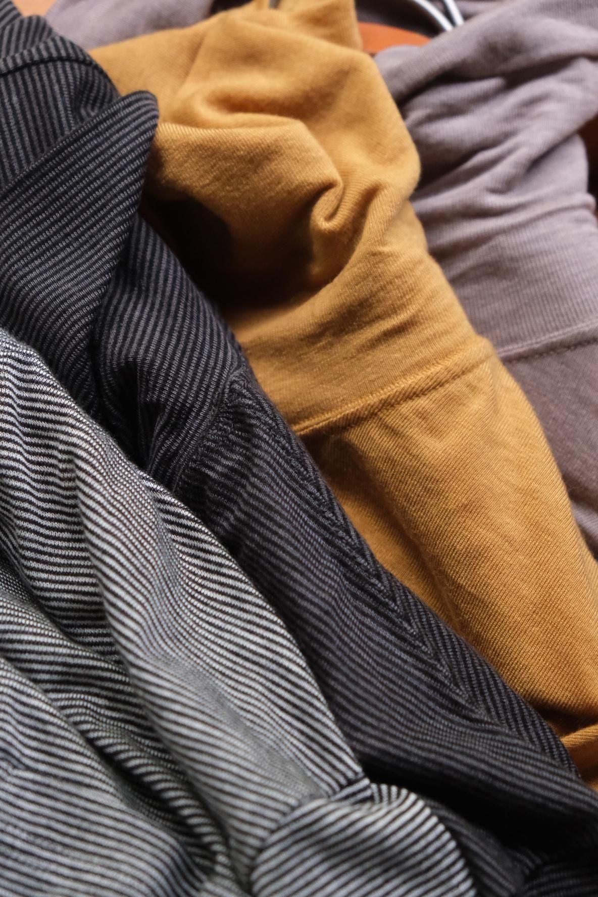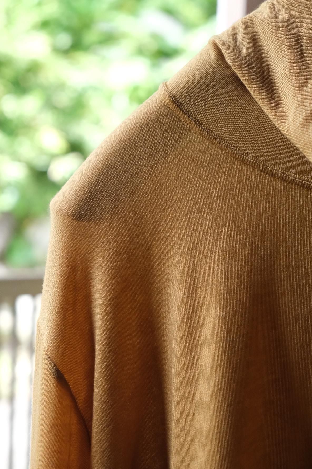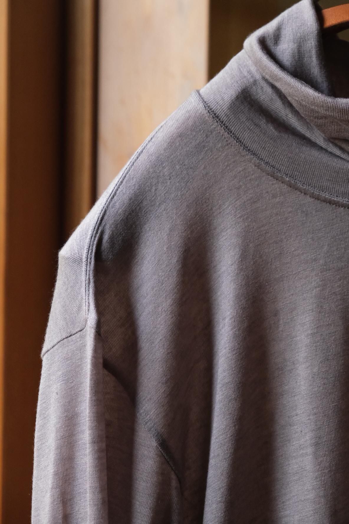 赤羽さんのお気に入りという 2シーズン前の生地を復刻。抜群に肌触りが良いカシミヤシルク混のシンプルなタートルネックカットソー。毎日でも着用したいと思うほど心地良い柔らかさと、洗濯表示に囚われずガシガシ洗えてしまう使い勝手の良さに惚れ込む。どこか 80’ s のエスプリの香りがするこのアイテムを、今季はテーラードやレザーのインナーにサラッと差し込みたい。