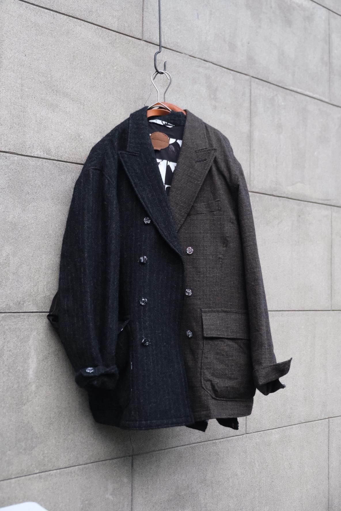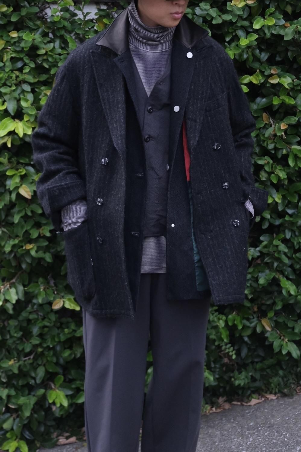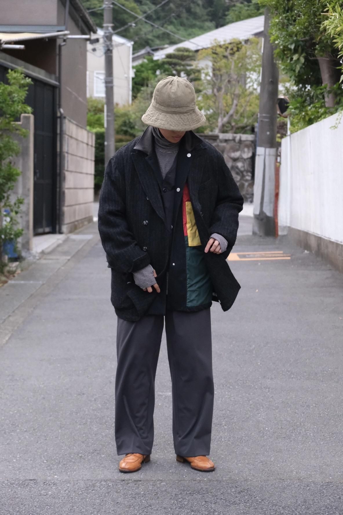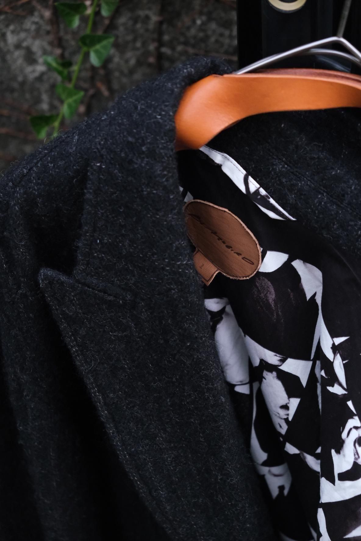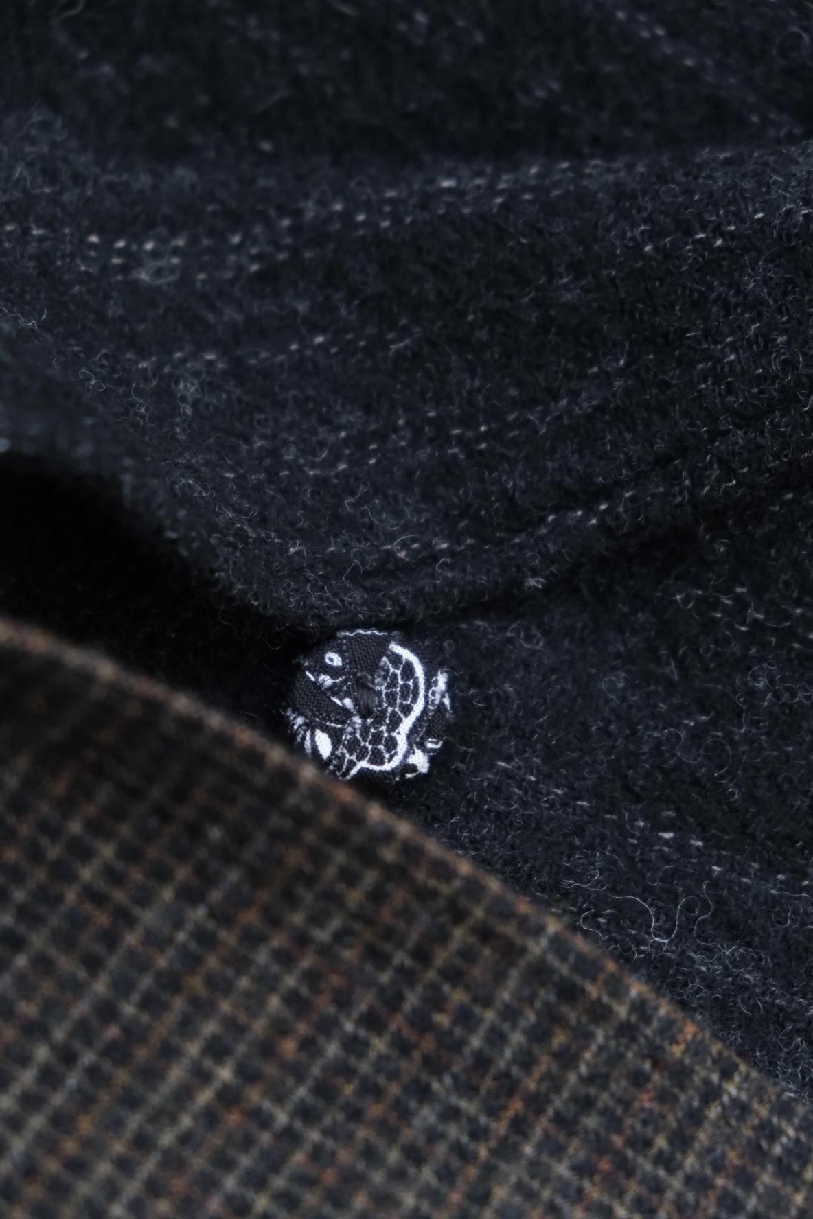常に革新的な歩みを続けるBLACKBIRDのシグネチャー、Director's Jacket。生地に合わせてパターンを変え、着た時のフォルムも異なるから飽きが来なくファンも多い。ジャケットのようでいてハーフコートのような、新顔のダブルブレスト。アーム含めてややゆとりを持たせたパターンへ刷新し、さらっと羽織るもレイヤードを楽しんでジャストに着てもよい懐の深さを持つ。生地やフォルムが相まって普段より柔らかい印象で落ち着いてる?ように見えるが、ご期待通りにすごい。ボタンは本来は廃棄されてしまう生地を裂いて巻きつけているから、使用と共にボロになって雰囲気が増していく。対となるカボタンはヴィンテージのキリムを丸くくり抜いたもの。裏地に目をやると大胆に白黒の世界。隙はどこにも見当たらない。とにかくやり切っている。ブランドの世界観が凝縮したこのジャケットは、他の追随を許さない仕上がり。