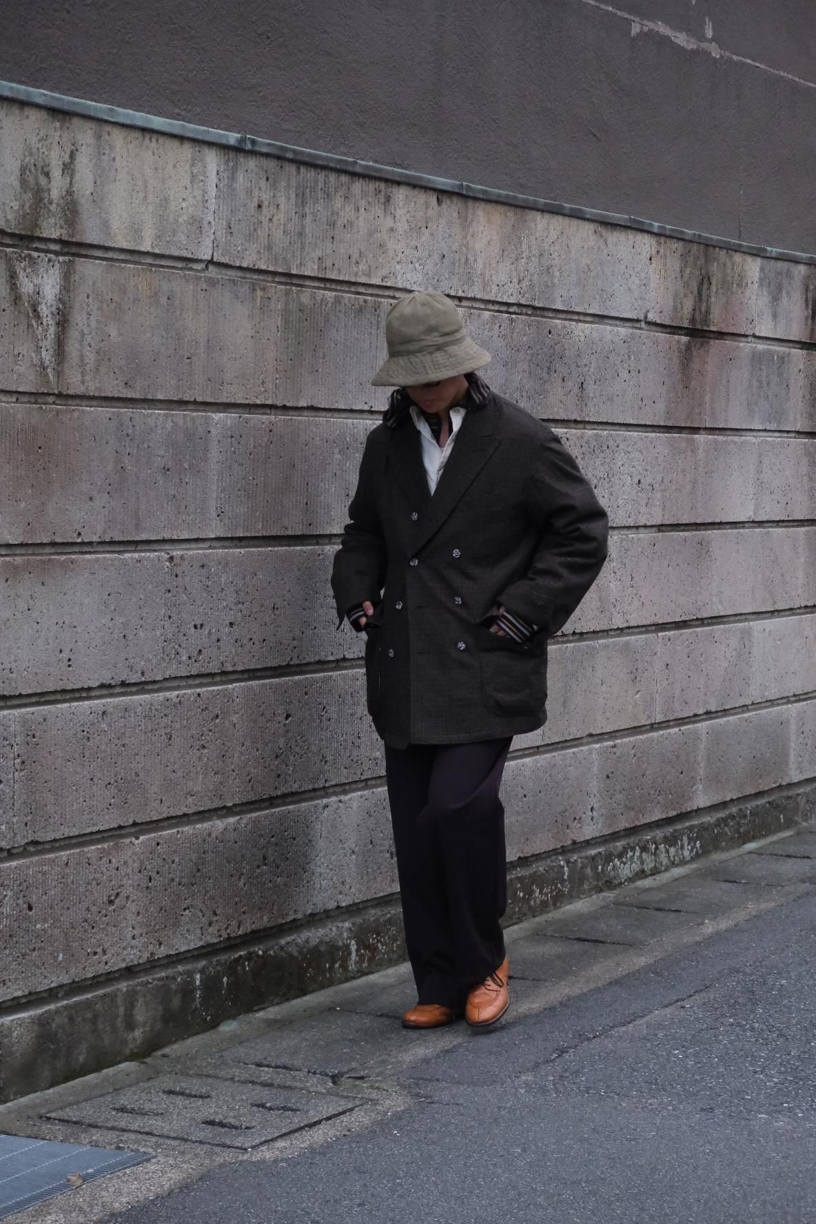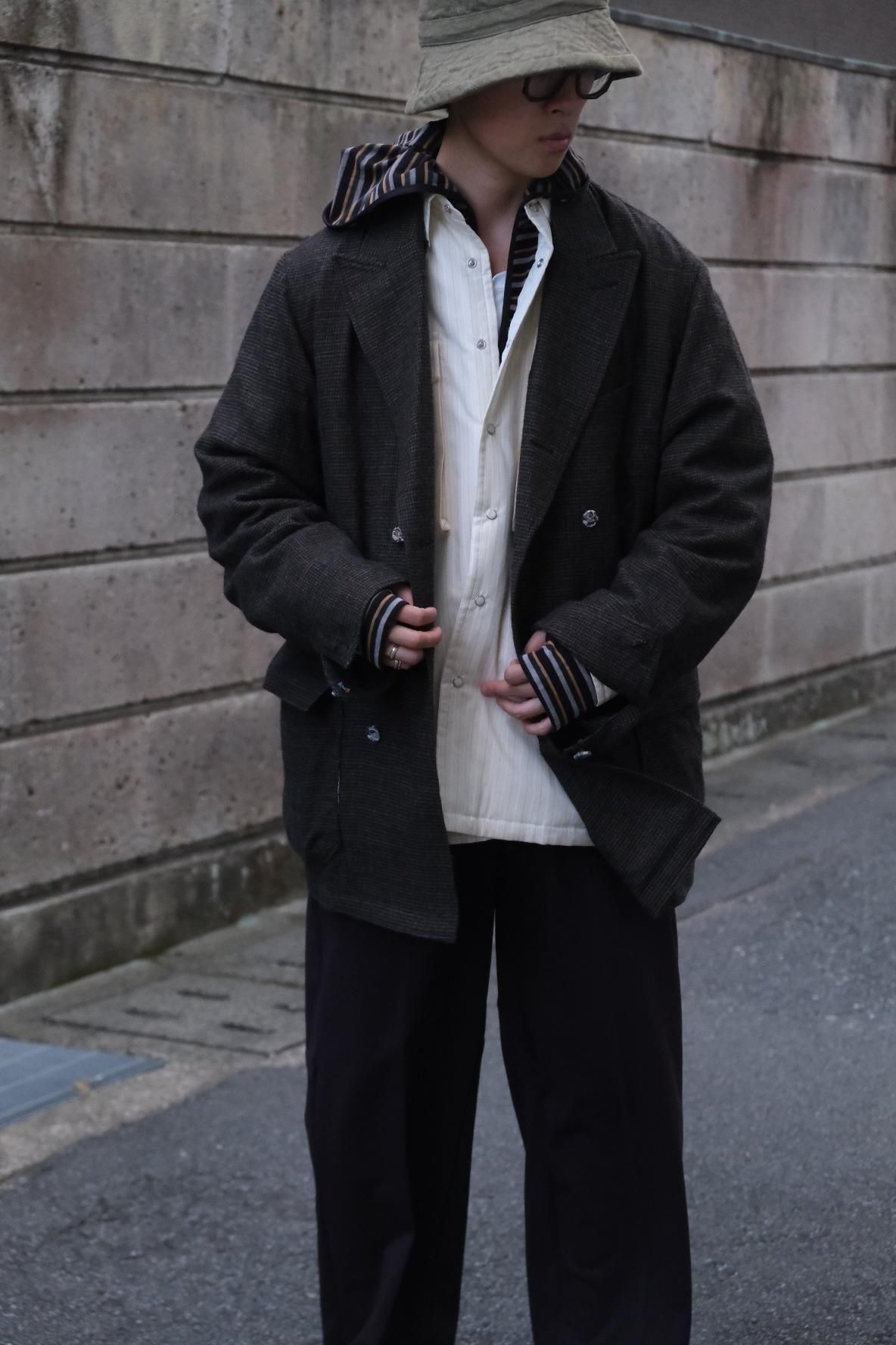 常に革新的な歩みを続けるBLACKBIRDのシグネチャー、Director's Jacket。生地に合わせてパターンを変え、着た時のフォルムも異なるから飽きが来なくファンも多い。ジャケットのようでいてハーフコートのような、新顔のダブルブレスト。アーム含めてややゆとりを持たせたパターンへ刷新し、さらっと羽織るもレイヤードを楽しんでジャストに着てもよい懐の深さを持つ。生地やフォルムが相まって普段より柔らかい印象で落ち着いてる?ように見えるが、ご期待通りにすごい。ボタンは本来は廃棄されてしまう生地を裂いて巻きつけているから、使用と共にボロになって雰囲気が増していく。対となるカボタンはヴィンテージのキリムを丸くくり抜いたもの。裏地に目をやると大胆に白黒の世界。隙はどこにも見当たらない。とにかくやり切っている。ブランドの世界観が凝縮したこのジャケットは、他の追随を許さない仕上がり。