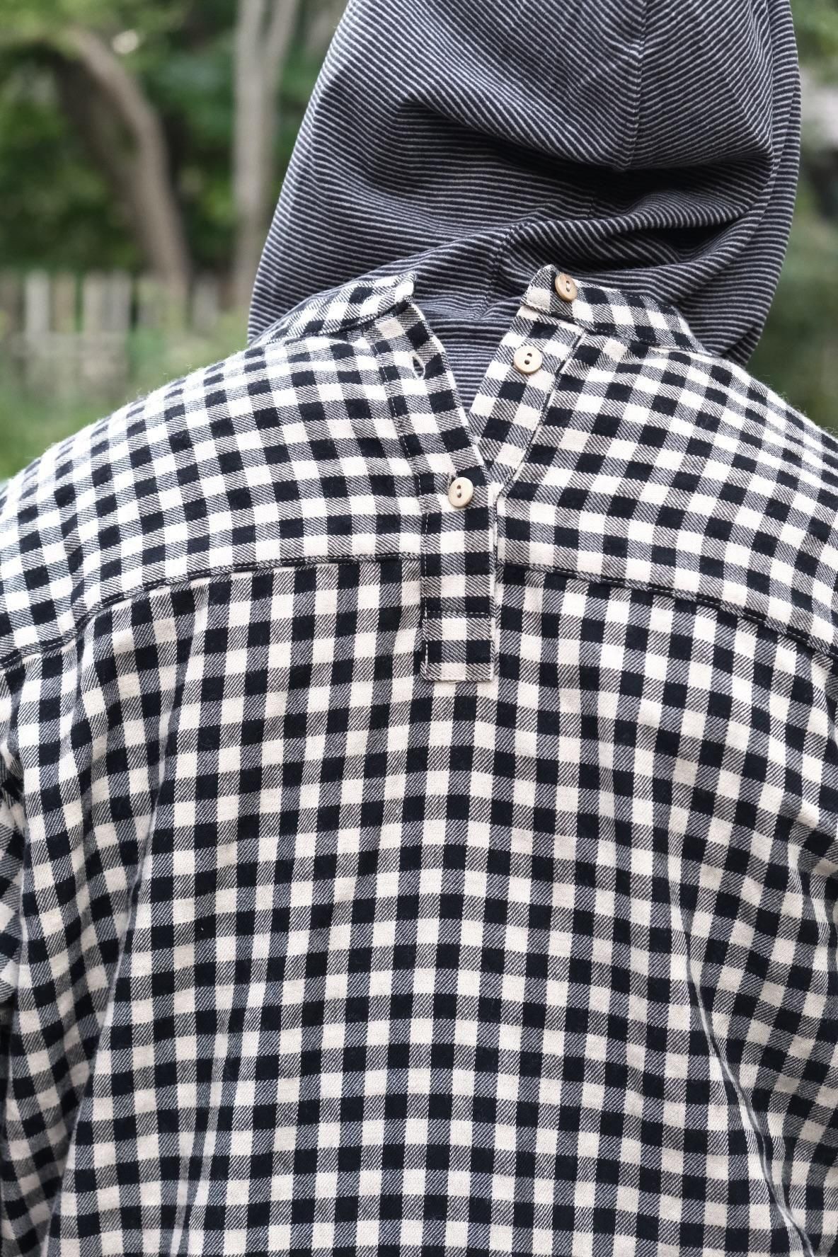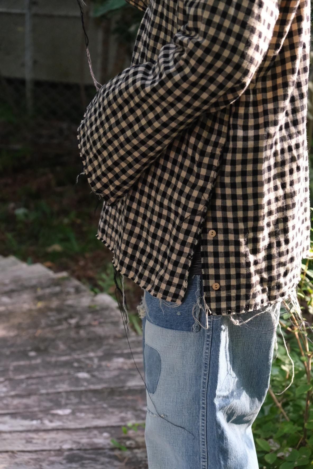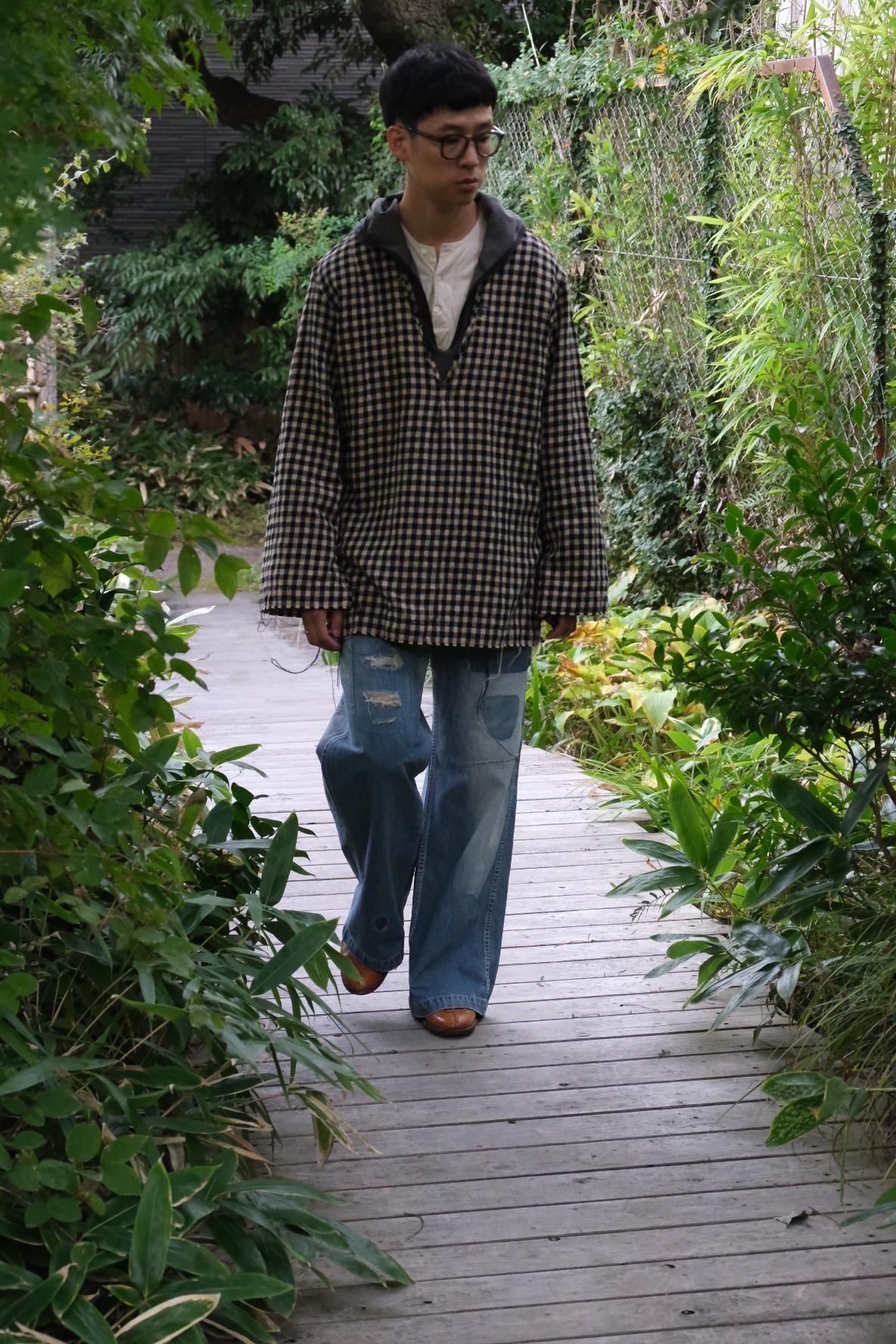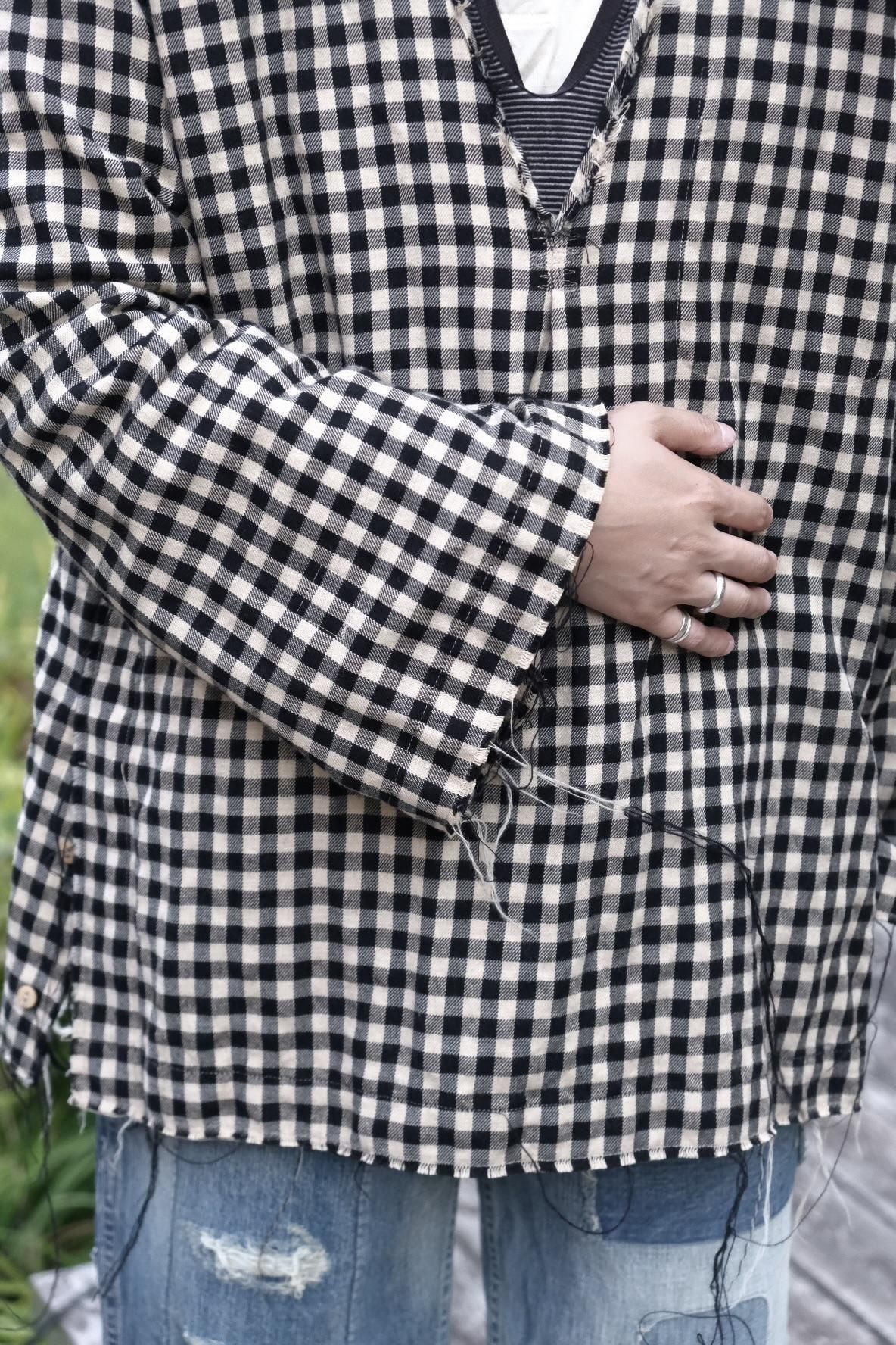 大胆に切りっぱを施したフロントのVネック、カフスのカッティング、ボタンの開閉でシャツの形を変えられるサイドスリットなど随所に新しいディテールを持つプルオーバーシャツ。その上で、BLACKBIRDのアイデンティティとも言える裁ち切りデザインはやり切っている。襟、カフス、裾でレイヤリングシステムを考えつつ、今季は何といってもVゾーンの重ね方が面白い。" Hooded Skipper "を入れ楽しんでほしい。身幅は少し削っているから、ジャケットやコートも重ねやすいと思う。