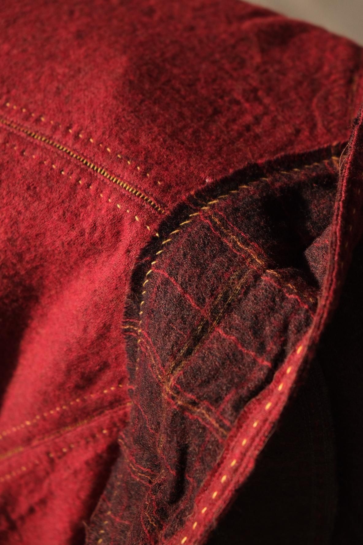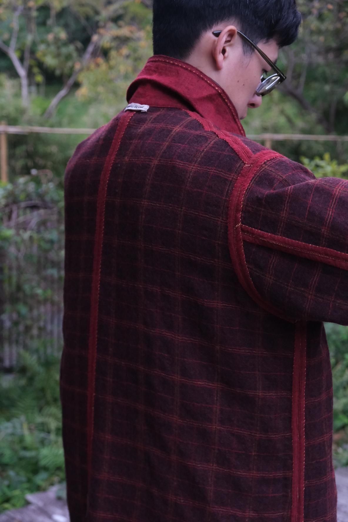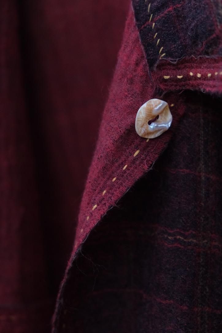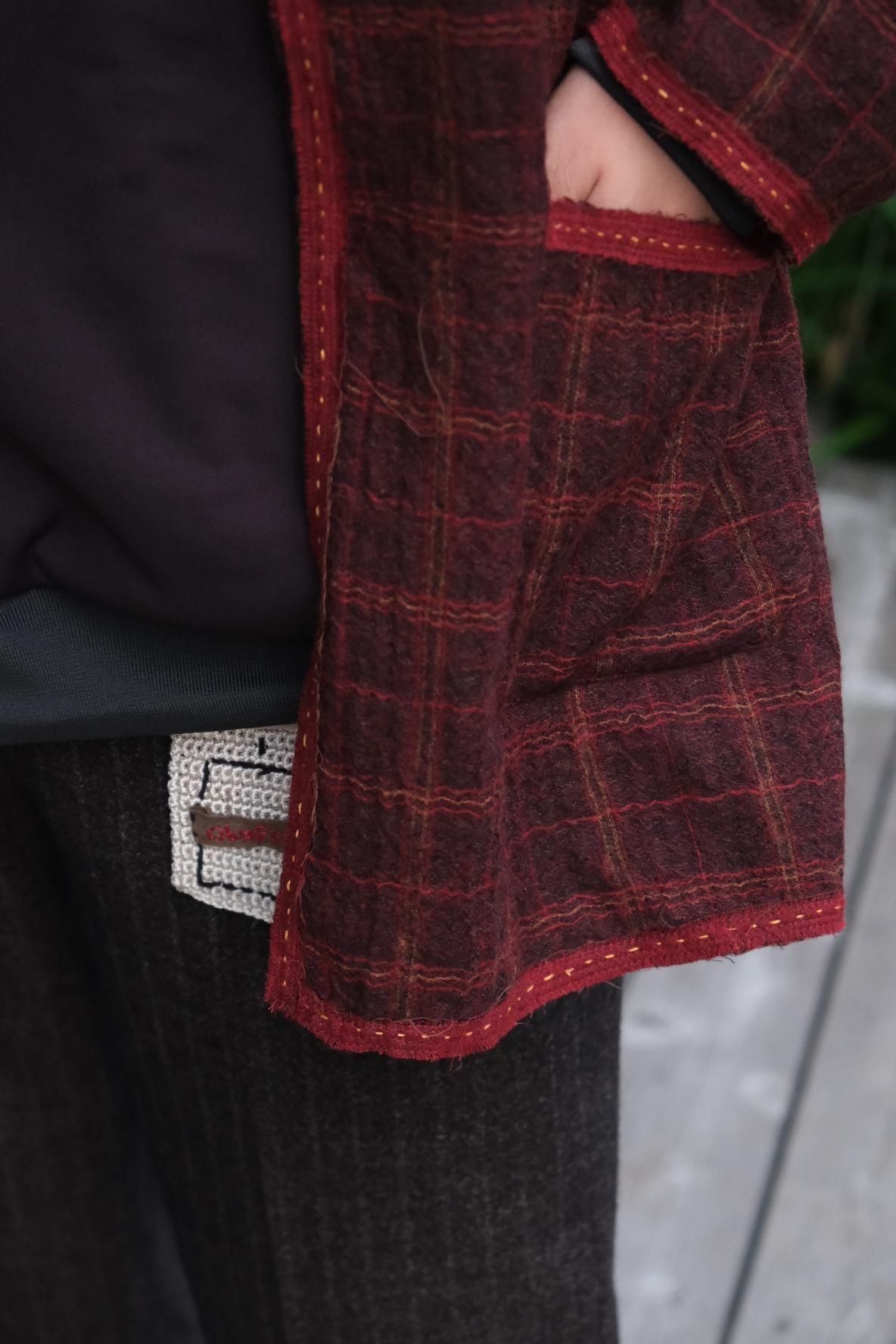 6月から毎月のようにグプタを提案してきたからこそわかる、進化とその凄み。柄の異なる共地を貼り合わせ、切ったり繋げたりとWフェイスでウラからオモテにはみ出てくる微かな組織が表情を豊かにする。ボイル特有の凹凸ある生地感にこれでもかとハンドステッチを施し、MAATEEの作品の中でも異彩を放つ1着に。カバーオールを数々作ってきたが、シャツのようにニットのように着れてしまう懐の深さは過去にはない。シンプルでいてシンプルではない、普遍的でいて普通ではない、インドの香りと一言で纏めるには言葉足らずな、もはやアートピースのような洋服だ。