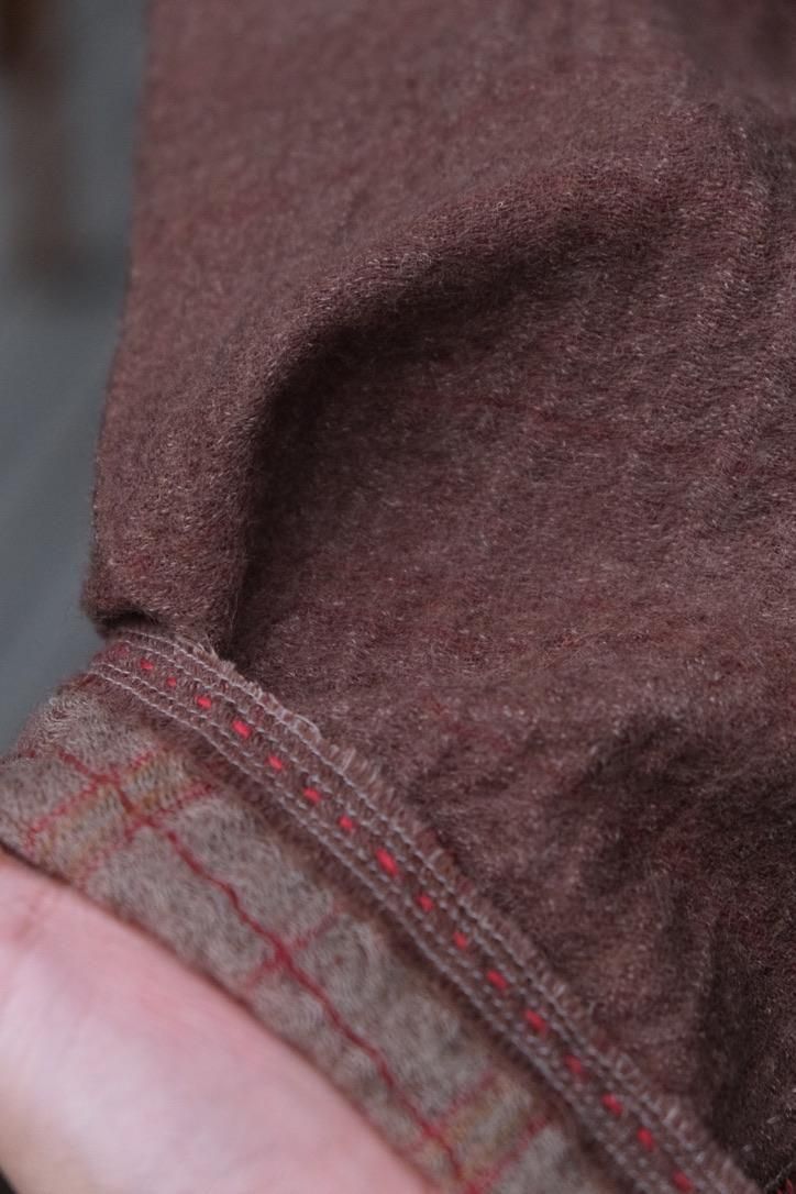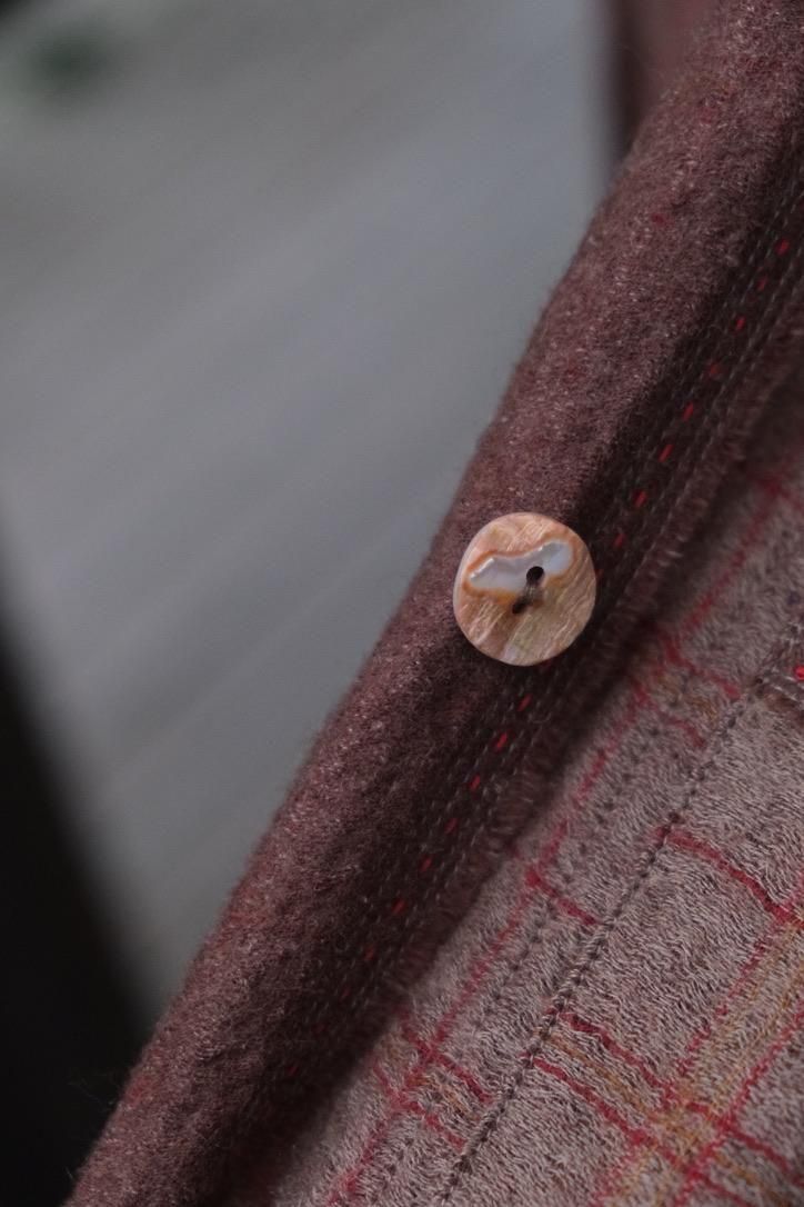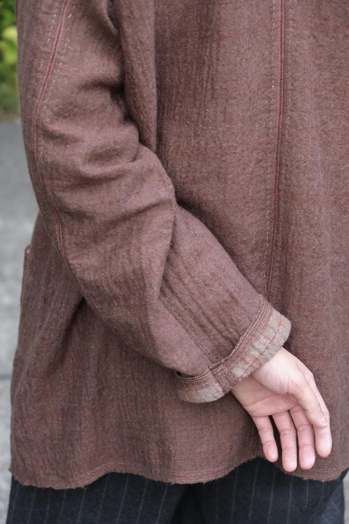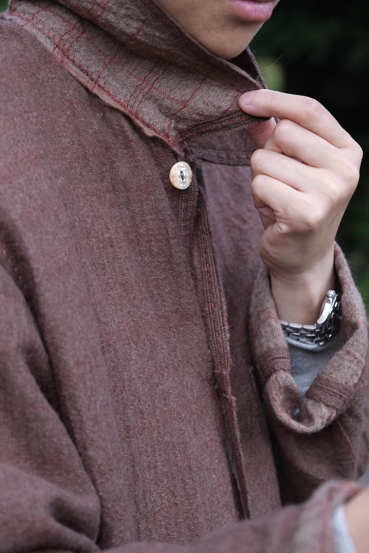 6月から毎月のようにグプタを提案してきたからこそわかる、進化とその凄み。柄の異なる共地を貼り合わせ、切ったり繋げたりとWフェイスでウラからオモテにはみ出てくる微かな組織が表情を豊かにする。ボイル特有の凹凸ある生地感にこれでもかとハンドステッチを施し、MAATEEの作品の中でも異彩を放つ1着に。カバーオールを数々作ってきたが、シャツのようにニットのように着れてしまう懐の深さは過去にはない。シンプルでいてシンプルではない、普遍的でいて普通ではない、インドの香りと一言で纏めるには言葉足らずな、もはやアートピースのような洋服だ。