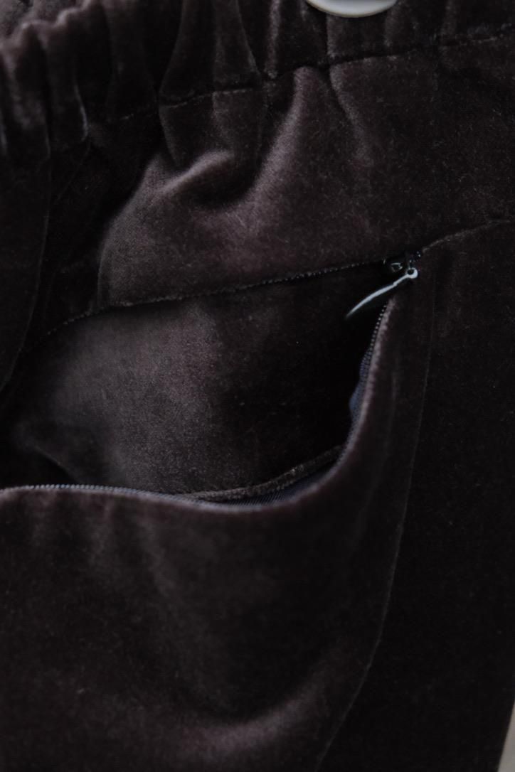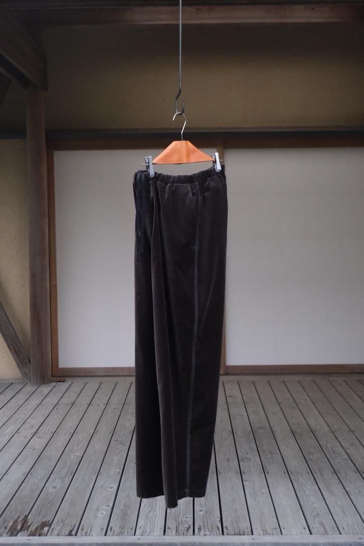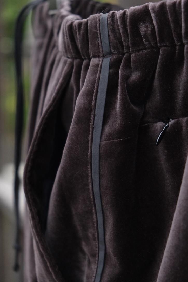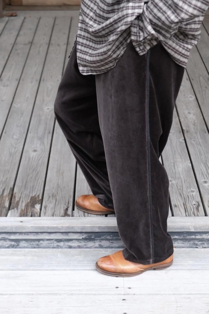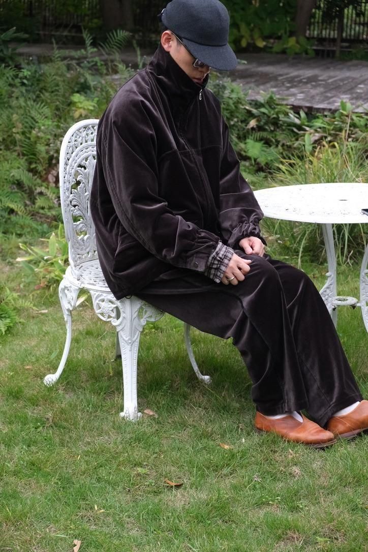 松村さんが作るリラックスウェアがいつも良い塩梅で、つい手にとってしまう。360°さまざまな角度から眺めてもラグジュアリー感があるベルベットを贅沢に使い、楽チンさと高級感という本来相反する関係性が見事に纏まる。総裏キュプラのスタンドジャケットはスポーティな外ツラからは想像できないほどに軽くて温かい。テーラードの下に入れてジップを閉めてしまえば来たる冬でも主役を張れる。トレパンは古着でもとりわけ好きな部類だが、大胆なハズシ係りとしてスタイリングのアイコンに変化する。サイドシームにはシルクテープを貼るなど細部までのディテールに抜かりなし。デニムやスラックス、ジャケット疲れが起きる季節の中盤以降にも、クローゼットに幅の出るプロダクトとして手に取っていただきたい。
