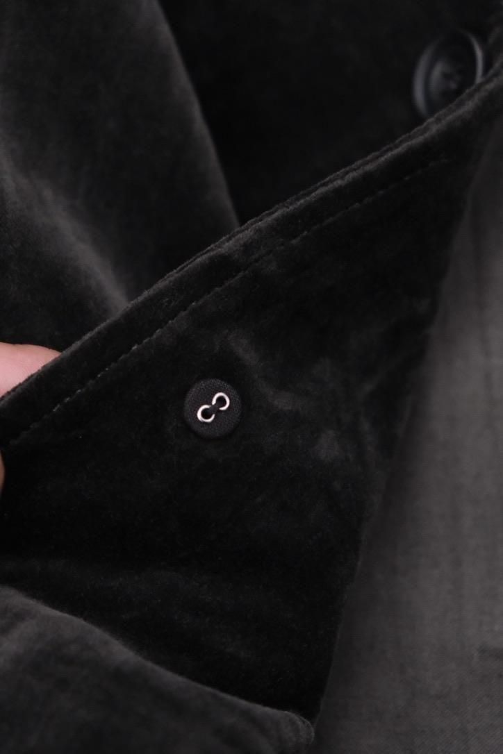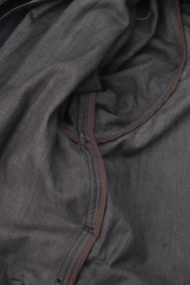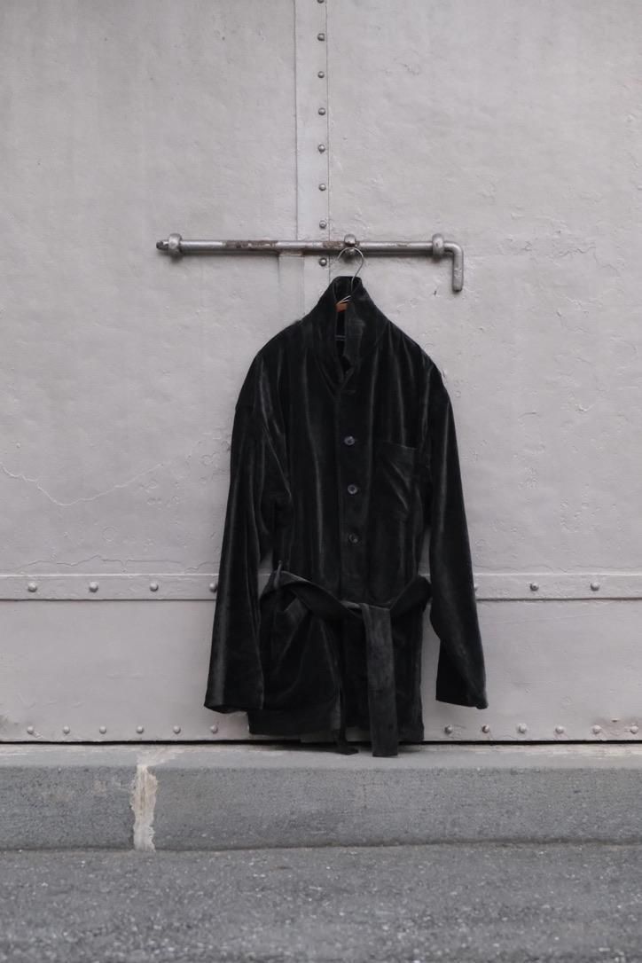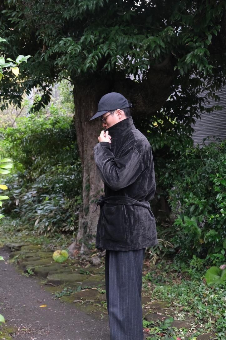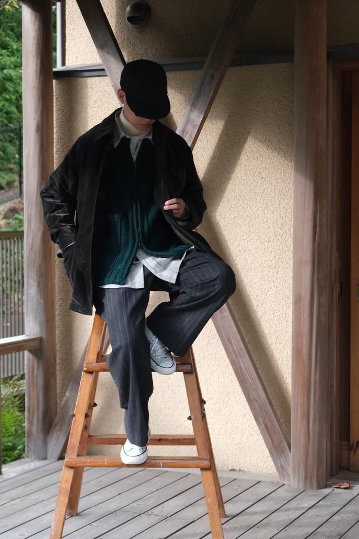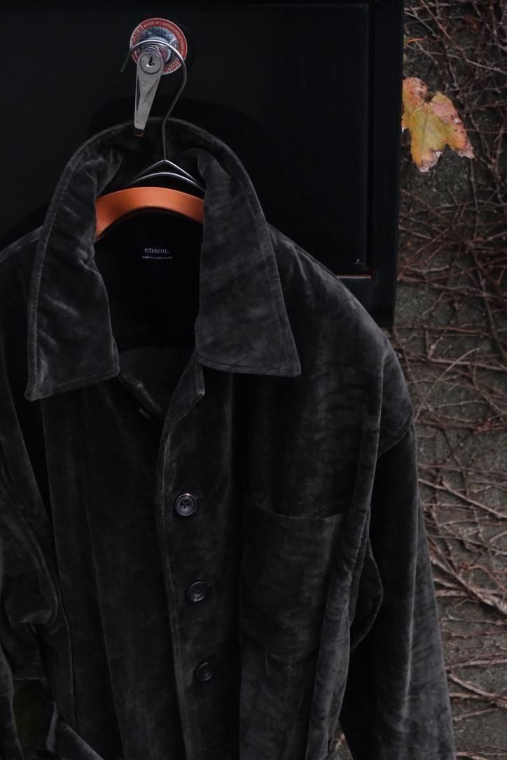 エンソウの名品番であるベルベットカバーオールが秋冬ver.としてリニューアル。夏のソレは"透ける"を大事にしたレイヤードスタイルを提案していて、コレは裏地を加えしっかり秋冬を楽しむアウタースタイルに変化。肉のあるベルベットに墨染めを施し元ある素材の濃淡の表情に、墨の濃淡が上乗せされ重厚感が出ている。驚くほどに風を通さない。ハーフコートのようにベルトを巻いて冬のAラインスタイルを楽しむもよし、インナーに挿せるカラーニットを用いて秋の夜長を楽しんでもよし、西川さんの提案する"エレガントさ"を存分に眺めてみよう。