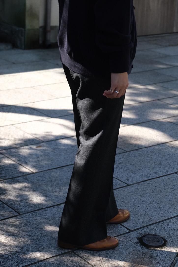 今1番普通に履きたいと思わせるほどのニュアンスフレア。靴のアッパーに裾が乗った時のモッタリ感と全体的なスッキリ感の差の妙味が絶妙なシルエットバランス。引き続きグレーは気分で、もはやカシミヤかと錯覚してしまうほどに肌触り滑らかな質感の梳毛ウールと、今季マーティの中でも稀有な生地だと世に知らしめた通称"みかん"のグリーンオレンジ。まだツータックワイドが主流な中で、この流れるような微フレアのシルエットがまた新鮮味を味わわせてくれる。