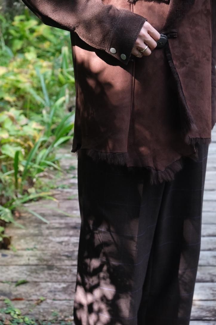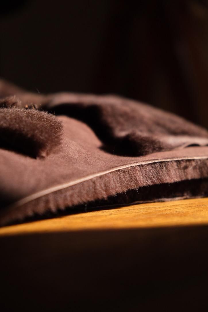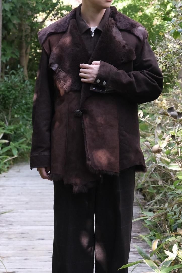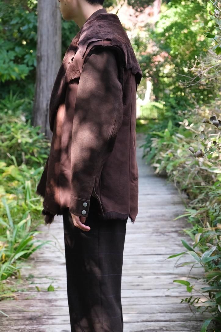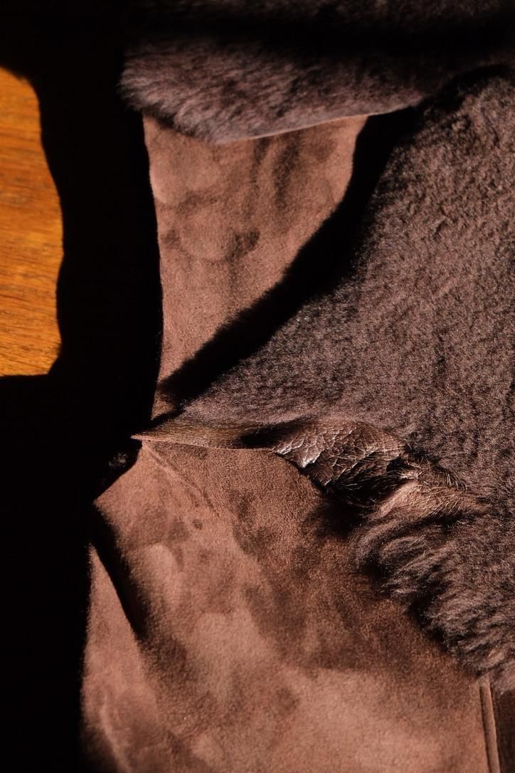 どう着るかワクワクする、重ねるムートン。テーラードの上に重ねてお堅い感じを崩しても、ブルゾンやコートの下に入れて大きなムートンの襟を出してやれば、お気に入りのアウターが全くの別物に変身するといった重ね方も良いだろう。保温性も申し分なくスタイリングのアクや違和感を容易に出せる洋服はそう多くはない。手作りによる裁断の個体差も面白く、羊毛の密度や質感も滑らかで、レザー本来の武骨さと繊細な部分が共存した同じものが1つとしてない天然製品である点も魅力的。秋や冬だけでなく、春にリネンシャツの上に羽織ったりと様々な素材との組み合わせが楽しみになるBLACKBIRD的提案力。