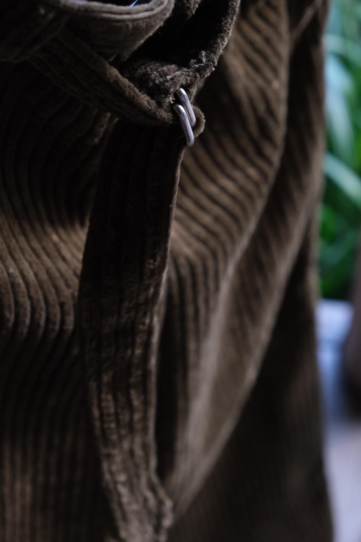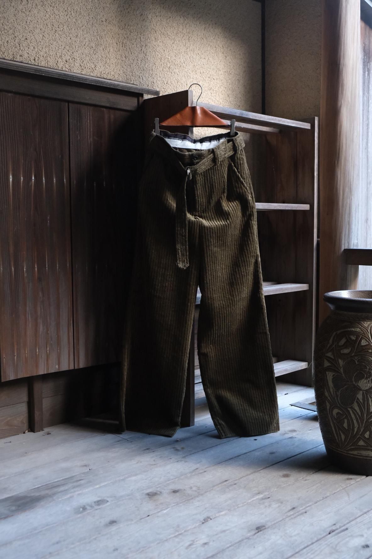冬に履きたくなる1本。みんな大好き?太畝のコーデュロイ。オリーブというあまり見かけないカラーをまとい、野暮ったさ全開でいて作りはEESETTらしくドレスディテールを完備。ウエストが多少緩くともパンチェリーナで内側でしっかりと留め、付属の共地ベルトで縛ってみてもいい。フラシ仕様で裾をダブルにしてブーツで合わせてみたり、クッション無しでドレスシューズに合わせてみたりもいいだろう。ドレスにワーク感全開の太畝コーデュロイはとにかく新鮮な面構えとなる。