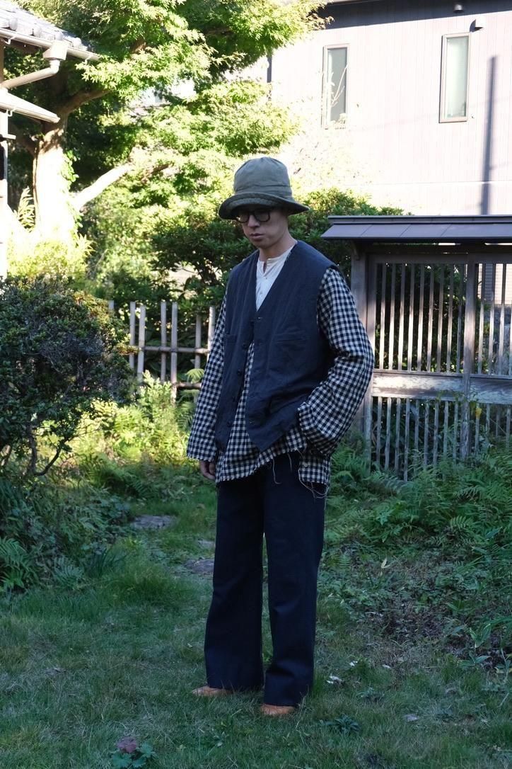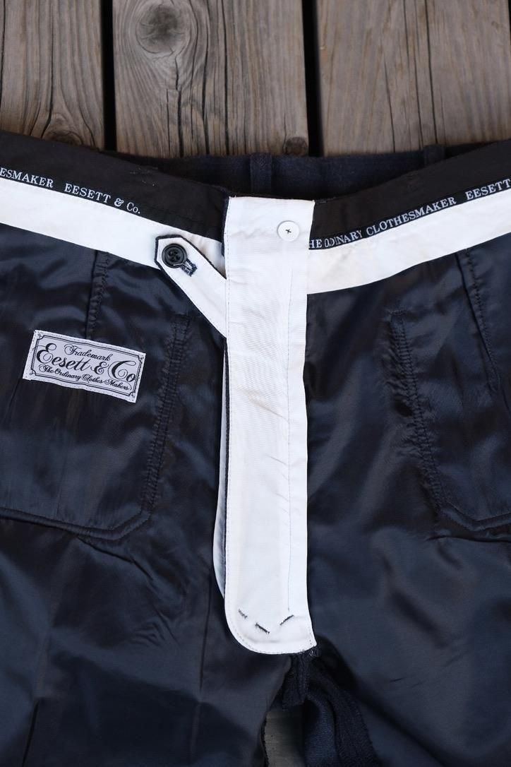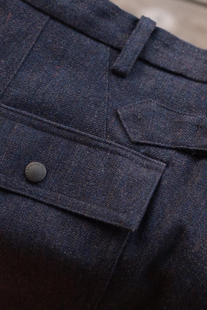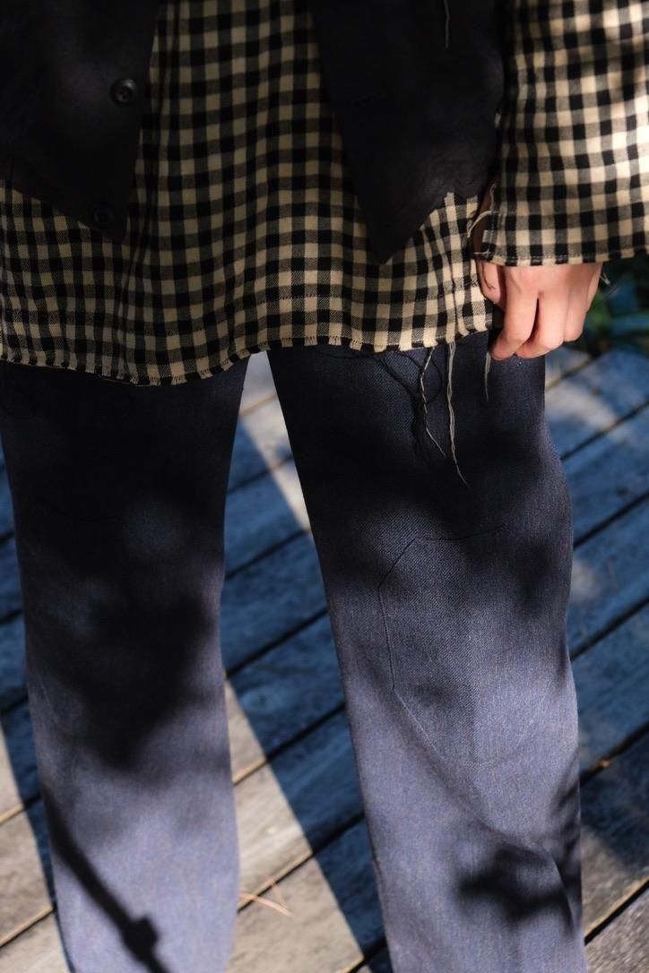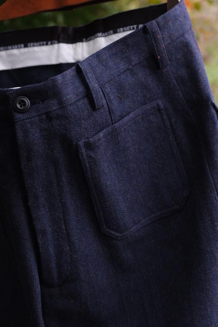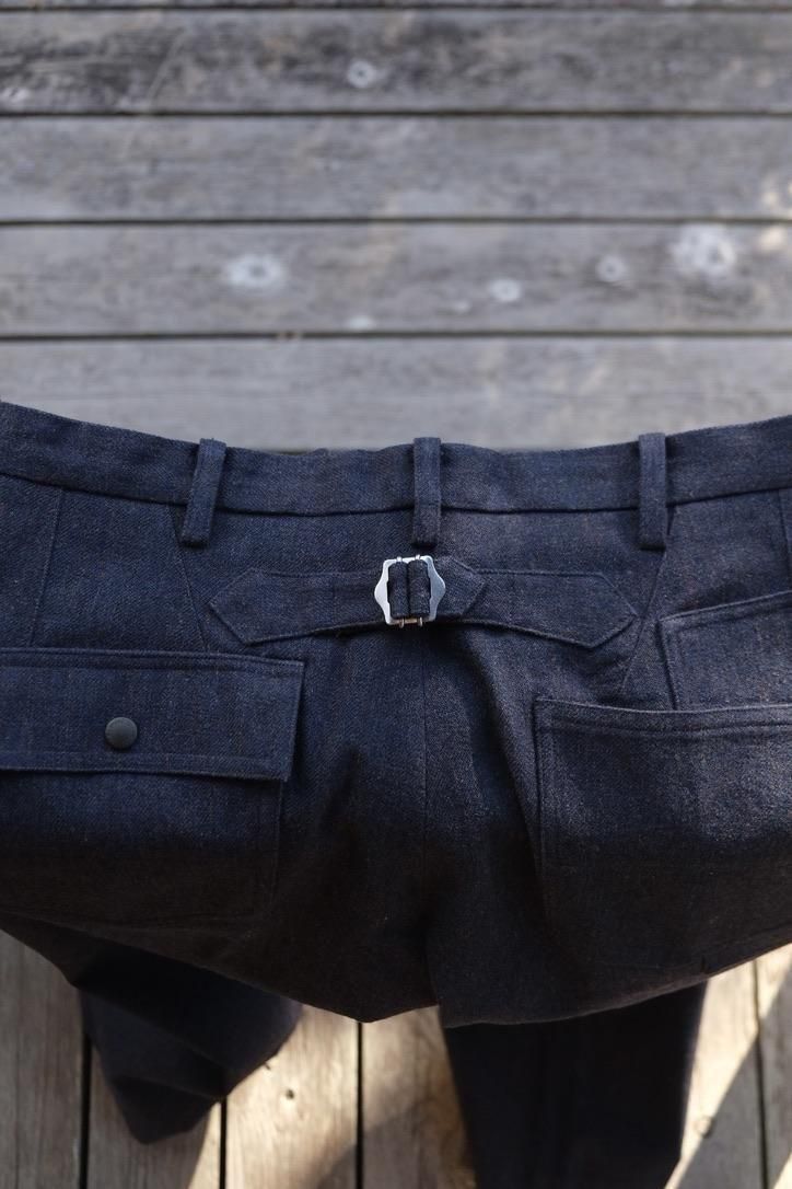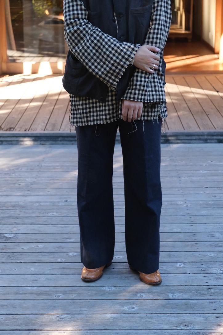 織組織はまるでデニム生地のようなウールサージのカリッとしたドライな表情と、インディゴを思わせるネイビーの中にカラーネップが奥まっている、なんとも不思議な冬生地に包まれたフレアトラウザー。USNセーラーパンツ?のようなポケットを使い、アイデンティティ溢れるジップ使いを通して隠されたバックポケットや尾錠、ニーパッチなどミリタリーの要素とテーラリングの融合が結集したイイセットの1本。履き心地に大きな影響を及ぼす点では裏の作りもしっかりとしている。マーベルトは手で留められていて、パンチェリーナで腰回りのフィット感も考えられているといったような時間と手間がかかる職人技も中澤さんによって丁寧に仕立てられている。全体的にはドレスヅラでディテールや素材はカジュアル、裏を返せば"キッチリと"といった体裁。