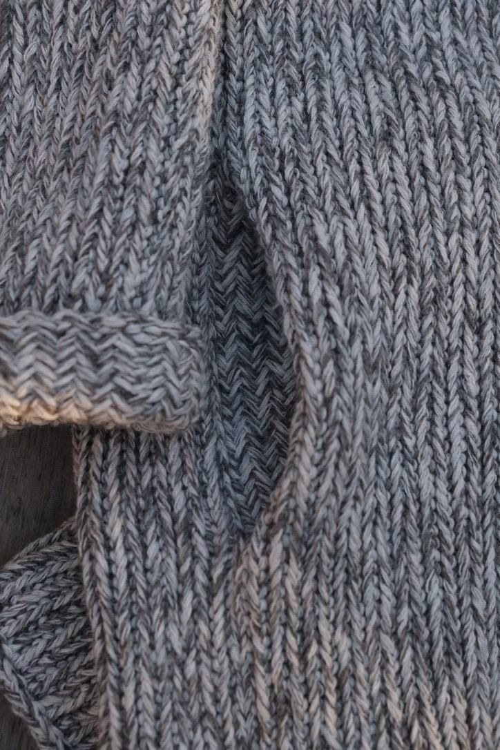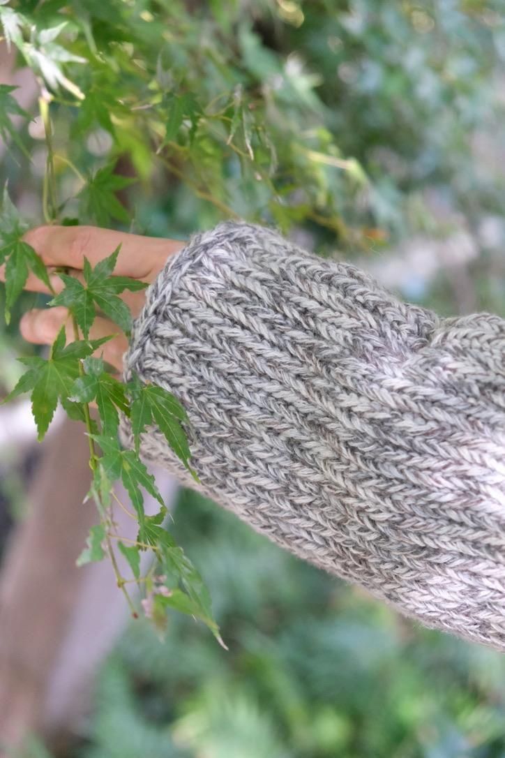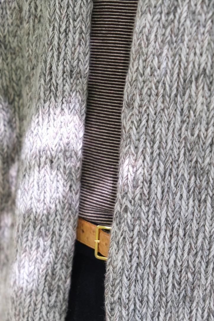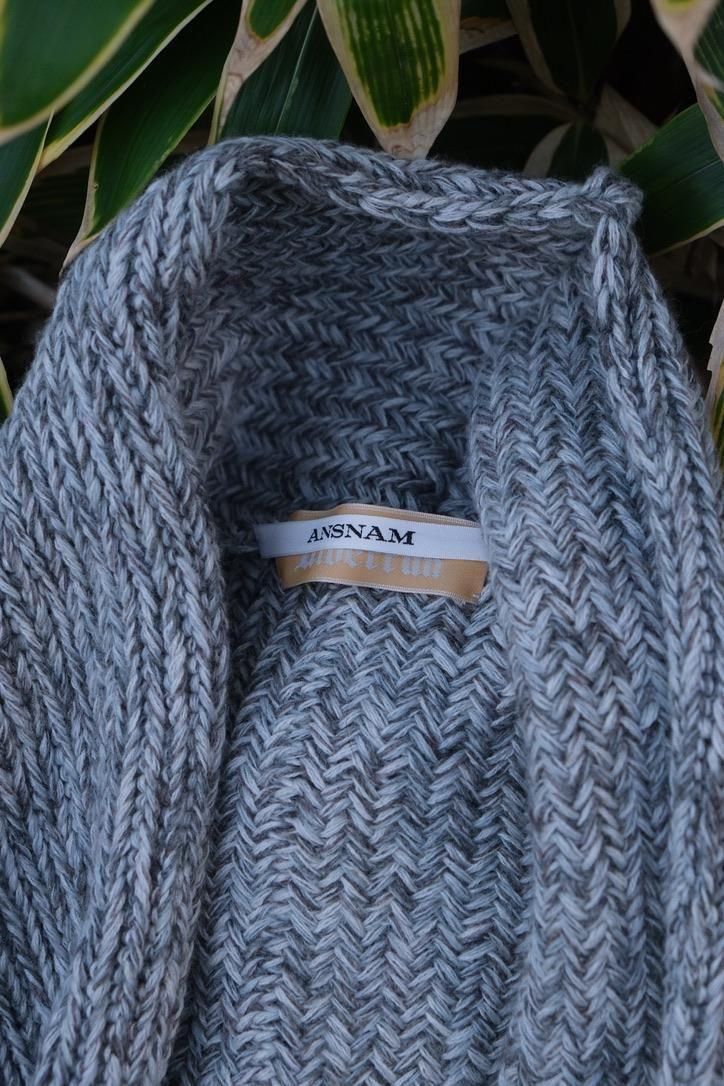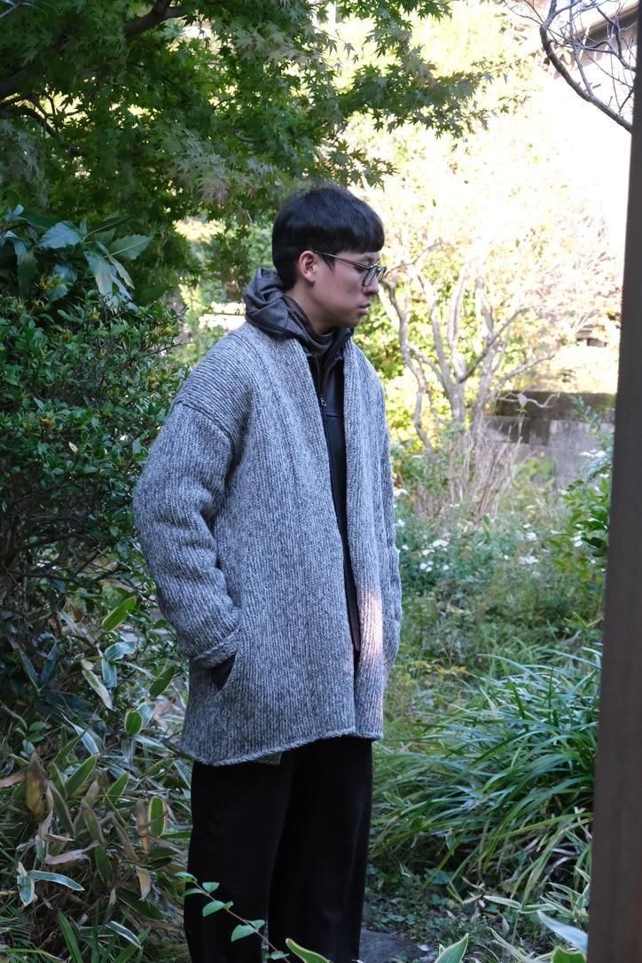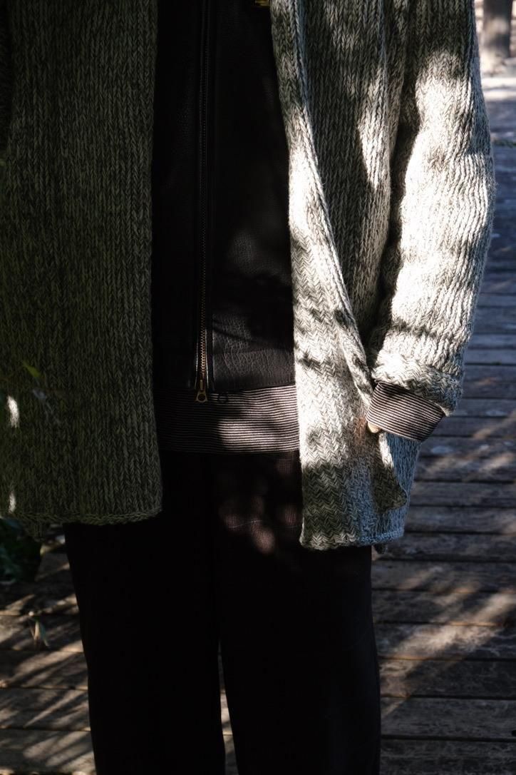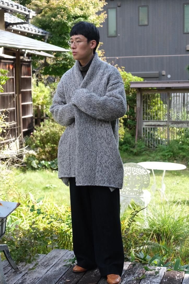ここ2年で幾多の手編みニットを見てきたけれど、これほどに風合いと迫力が共存したものはなかったかもしれない。繊維自体を束ねるのが難しいカシミヤウールを手紡ぎし多本取したものを、オモテは天竺編みでウラはヘリンボーン編みで特殊製法により編み立て仕上げている。ゆえに形はシンプルに付属品なしの(トワル状態)ショールカラー。縦長に見えるもアンスナムのパターンらしく、カマを深めにしっかりアウターヅラでレザージャケットの上に羽織ってもストレスなく着用できる。濃淡あるグレーとオフミックスの多色仕立てで、これまた合わせる服の難しさは微塵も感じない。
