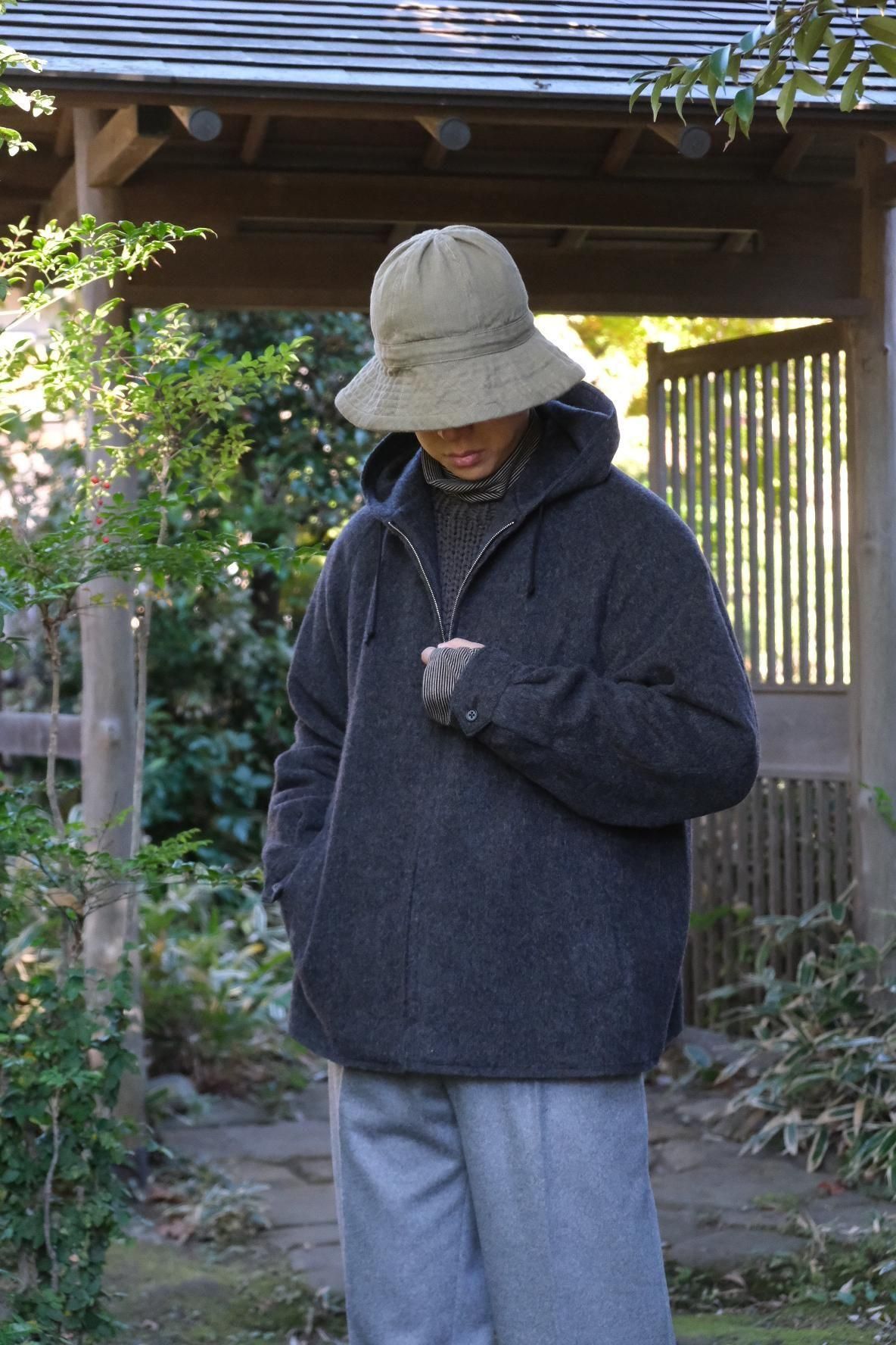 とっつき易いカバーオールのデザインでテーラードジャケットほど堅苦しくはないが、クラシックな織り柄生地で一定のドレス感は纏い、よく見るとマーティーらしい静かなる狂気を感じさせるディテールが要所要所に散りばめられ、ボーダーレスに幾つものジャンルをセンスよく調和させている。ウールカシミヤリネンという最上の素材のいいとこ取りをした軽量で暖かい冬らしい生地でいて、見た目以上に着心地が軽く脳が錯覚を覚える。裏からチクチクと、表の顔に忍ぶ奥深い赤やグレーなど多色を纏うのも重ねていく上ではレイヤードの要素として重要度を増してくる。ボックスシルエットでレイヤードし易く、単衣のお陰で冬時期はミッドレイヤーとしてコートやブルゾンの中に着こむ事も可能な汎用性の高いアイテム。