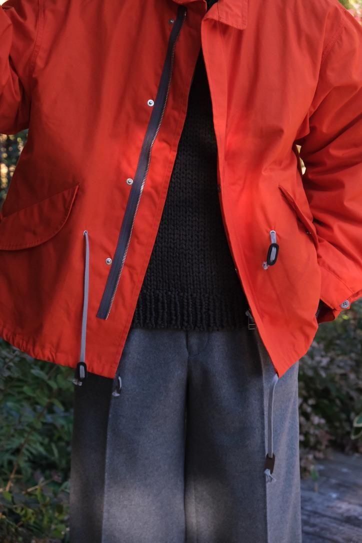 アメリカ物がイングランドのカルチャーとして確立された"モッズ"の背景に惹かれ制作されたという2年前の冬。着丈を短めにした丸っこいフォルムは、裾や胴回りを絞ることでさらに1段階ショート丈にアレンジでき、現代のスタイリングにも取り入れ易い。ドレトラやジェフリーといったツータックワイドにも、フレアやドレス味あるテーパードにも合ってしまうのだから敵なしといったところ。強烈なインパクトカラーのオレンジのシェルは、高機能素材のVentileを採用したとなればもはや垂涎の的。撥水、防風、耐久性も申し分なくライニングのボアがあれば真冬にも対応。またライニングとフードも取り外し可能で、シーズンレスで着用できるのも嬉しい。1着で4役?5役?の役回りをしてくれる、ハナレのスラックスラヴァーへ送る最強の刺客の復活だ。